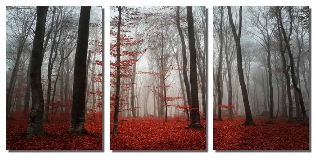 36"œ x 18"œ total size. Ready To Hang! (3 pieces - 12"œ x 18"œ each). 3 Panel Split (Triptych) Red & Gray Forest mist Metal Print. Modern metal wall art for home or office wall decor & interior design. Printed on Luxurious, HD aluminum glossy metal panels. Multi panel art.. HD aluminum panels. Metal print wall art. Includes Shadow Wall Mount on the back.• Aluminum Metal Wall Art• Made in USA• Ready to hang - No assembly required• Shadow mount hardware on the back• 0.045"œ thick HD Aluminum Panels• Scratch resistant, glossy finish• Superb color clarity, luxurious prints• Epson printing process• For indoor or moisture rich environment use• Easy to clean. Gently wipe with microfiber cloth.