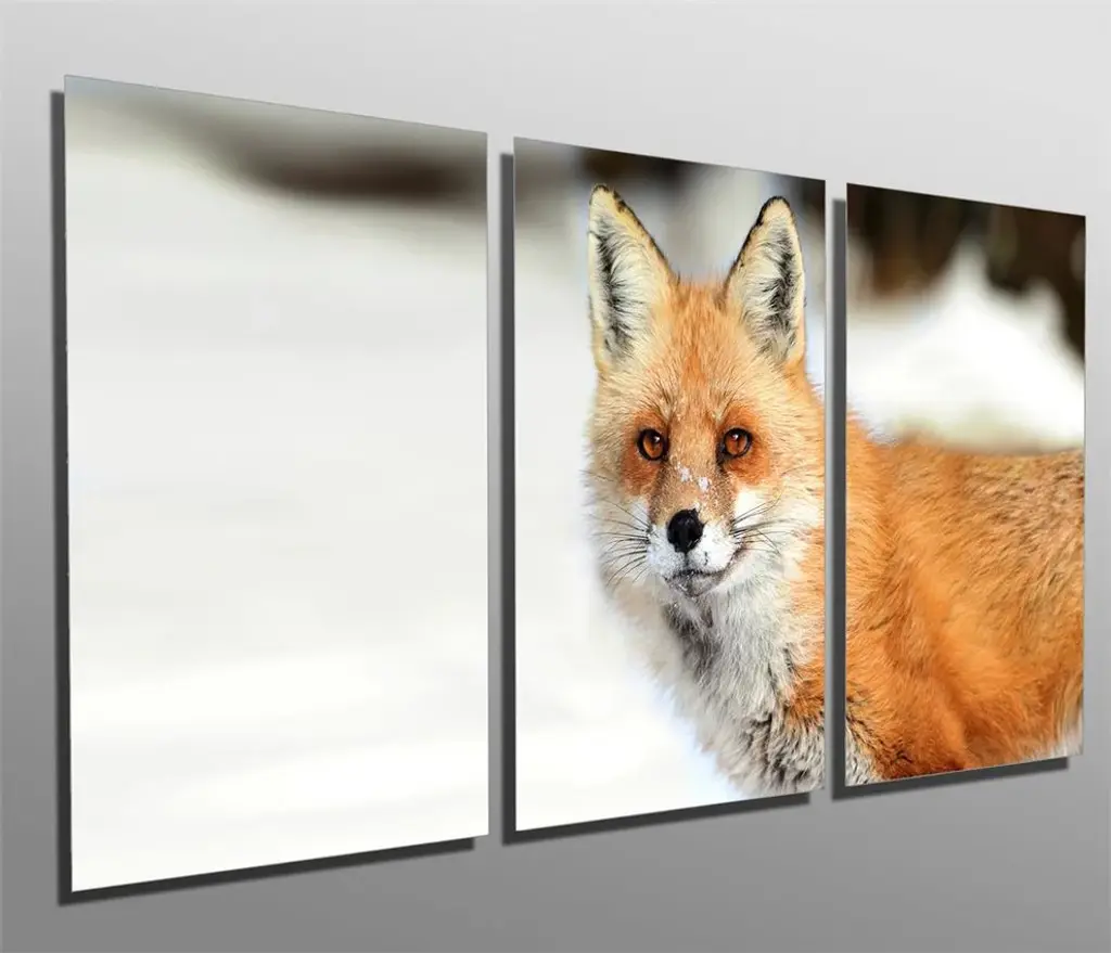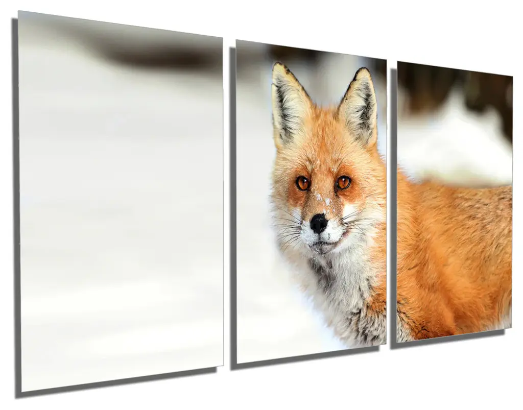 72"œ x 36"œ total size. Ready To Hang! (3 pieces - 24"œ x 36"œ each). 3 Panel Split (Triptych) Red Fox Portrait Metal Print. Modern metal wall art for home or office wall decor & interior design. Printed on Luxurious, HD aluminum glossy metal panels. Multi panel art.. HD aluminum panels. Metal print wall art. Includes Shadow Wall Mount on the back.• Aluminum Metal Wall Art• Made in USA• Ready to hang - No assembly required• Shadow mount hardware on the back• 0.045"œ thick HD Aluminum Panels• Scratch resistant, glossy finish• Superb color clarity, luxurious prints• Epson printing process• For indoor or moisture rich environment use• Easy to clean. Gently wipe with microfiber cloth.