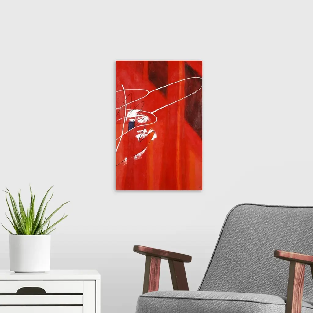 A vibrant red abstract painting with white curved lines overlaying on one side.