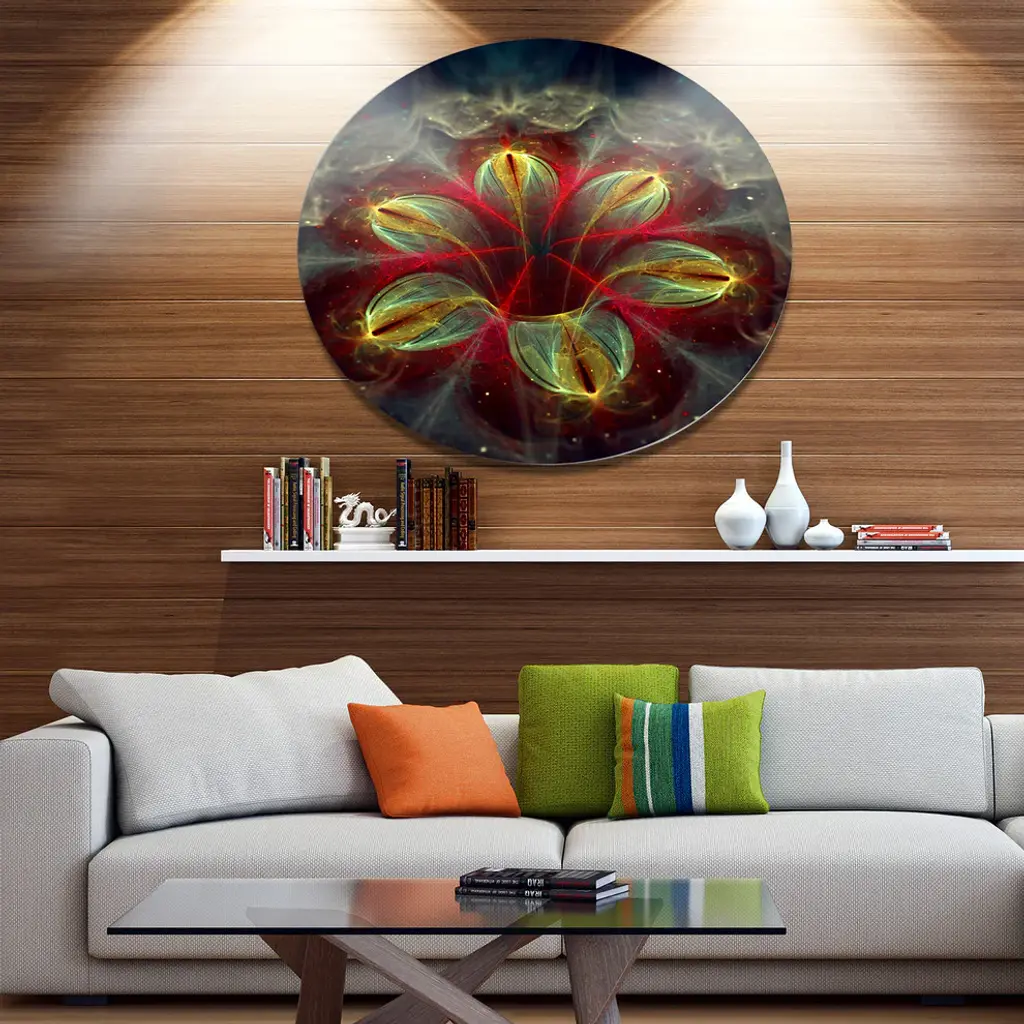 Bring Contemporary Abstraction to your home with this large Circle Metal wall art. This Red Golden Colorful Fractal Design Metal Artwork makes it the focal point of any room or office. - White Gloss Coating ensures colors are extra vibrant with light reflection.- Aluminum grade Sheet Metal with 1 inch mounting frame on the back giving the illusion that the artwork is floating on the wall..- Mounting Brackets are included along with instructions.- High Quality Digital images are created directly into a glossy aluminum panel producing a stunning and captivating print into the glossy finish of the metal.- Water, Fire and Scratch resistant HD Aluminum panels.- Looks better than any photo paper and guaranteed to last at least 20 years- Easy to clean with a microfiber cloth. Colors are far superior to regular Canvas Art. - Easy to Hang