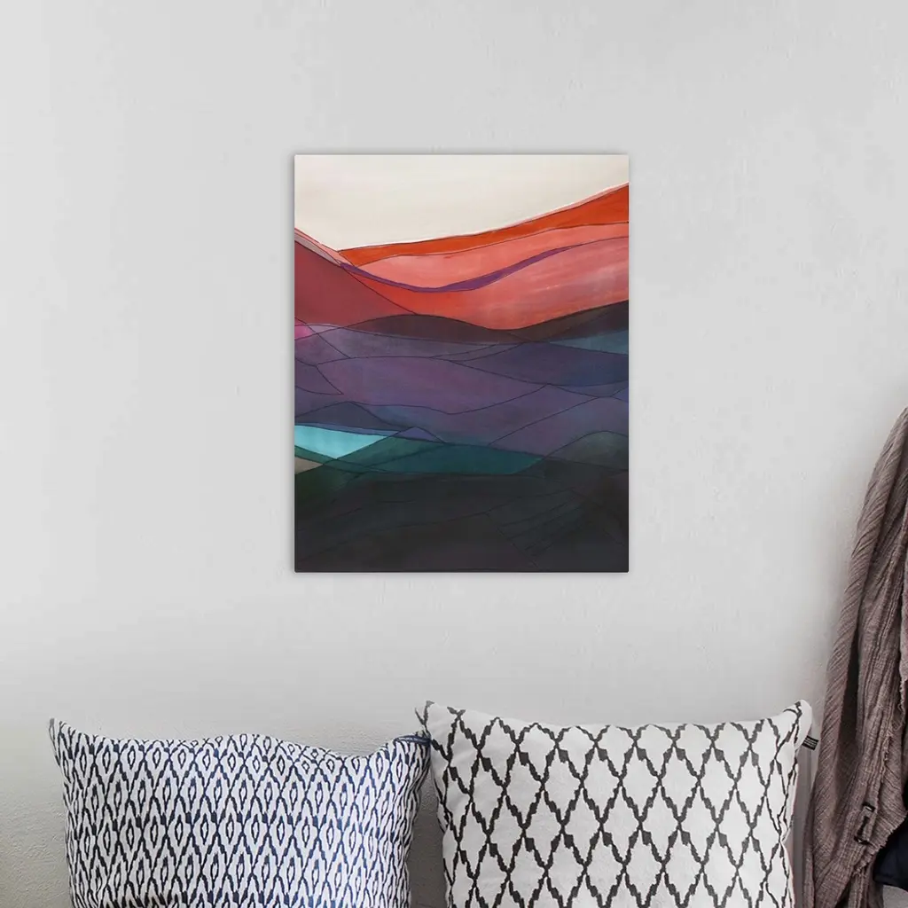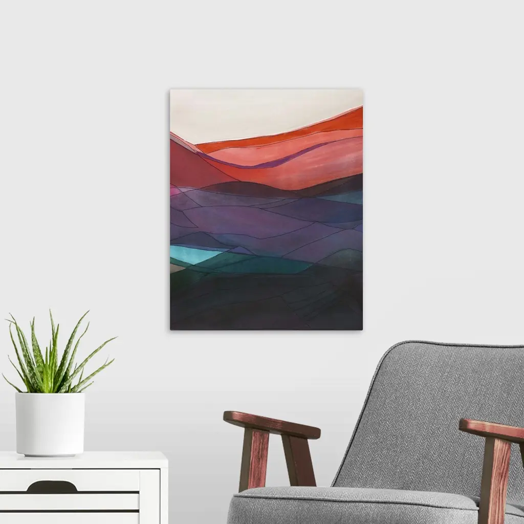 Contemporary abstract painting resembling a mountainous valley made of different color sheets.