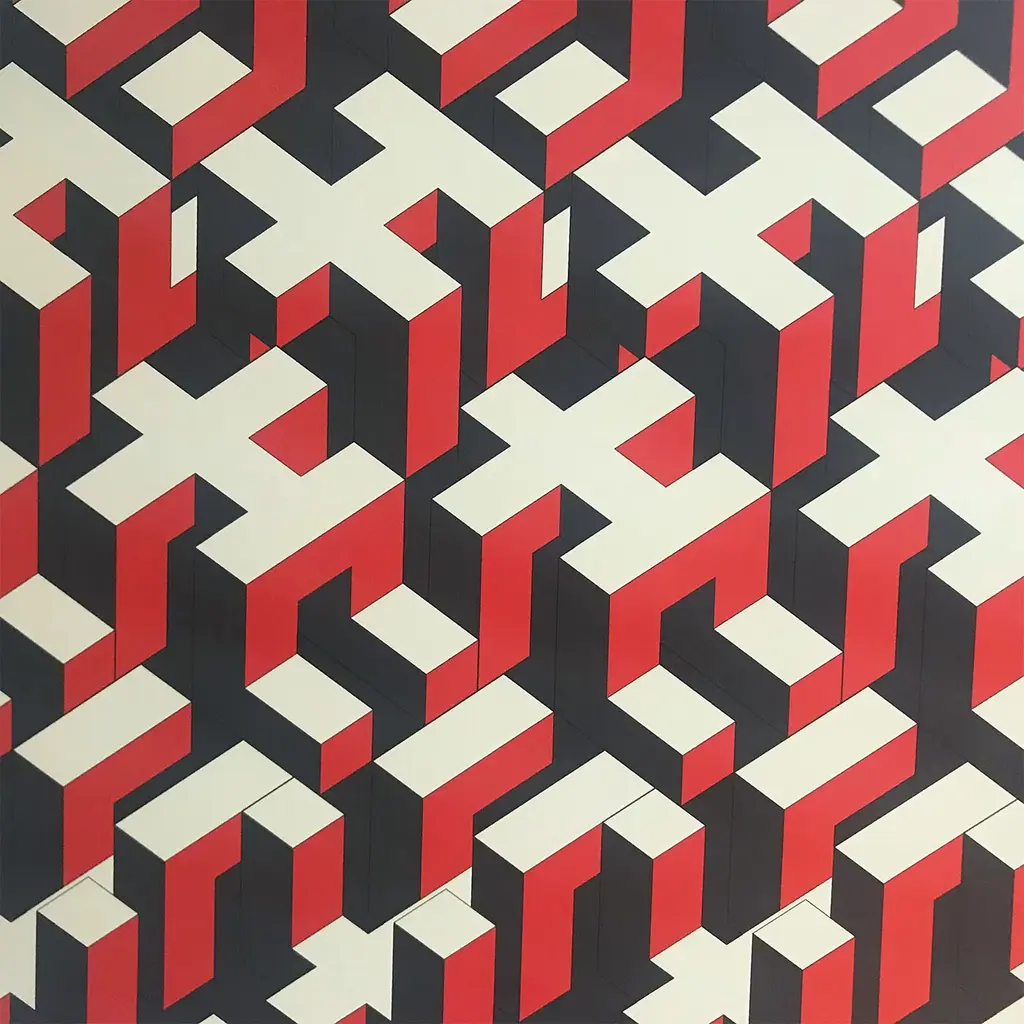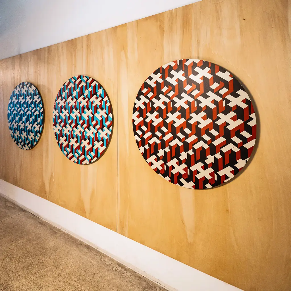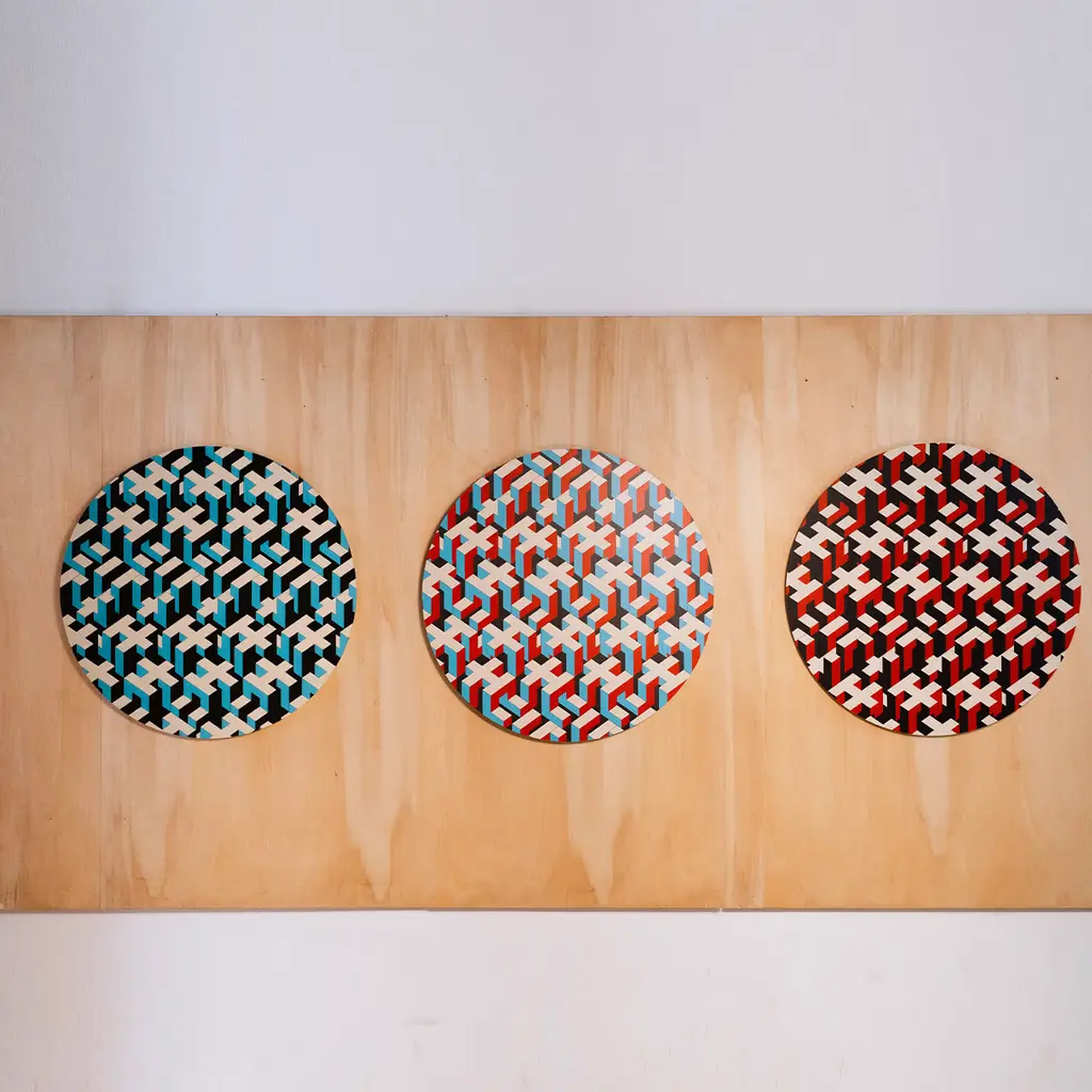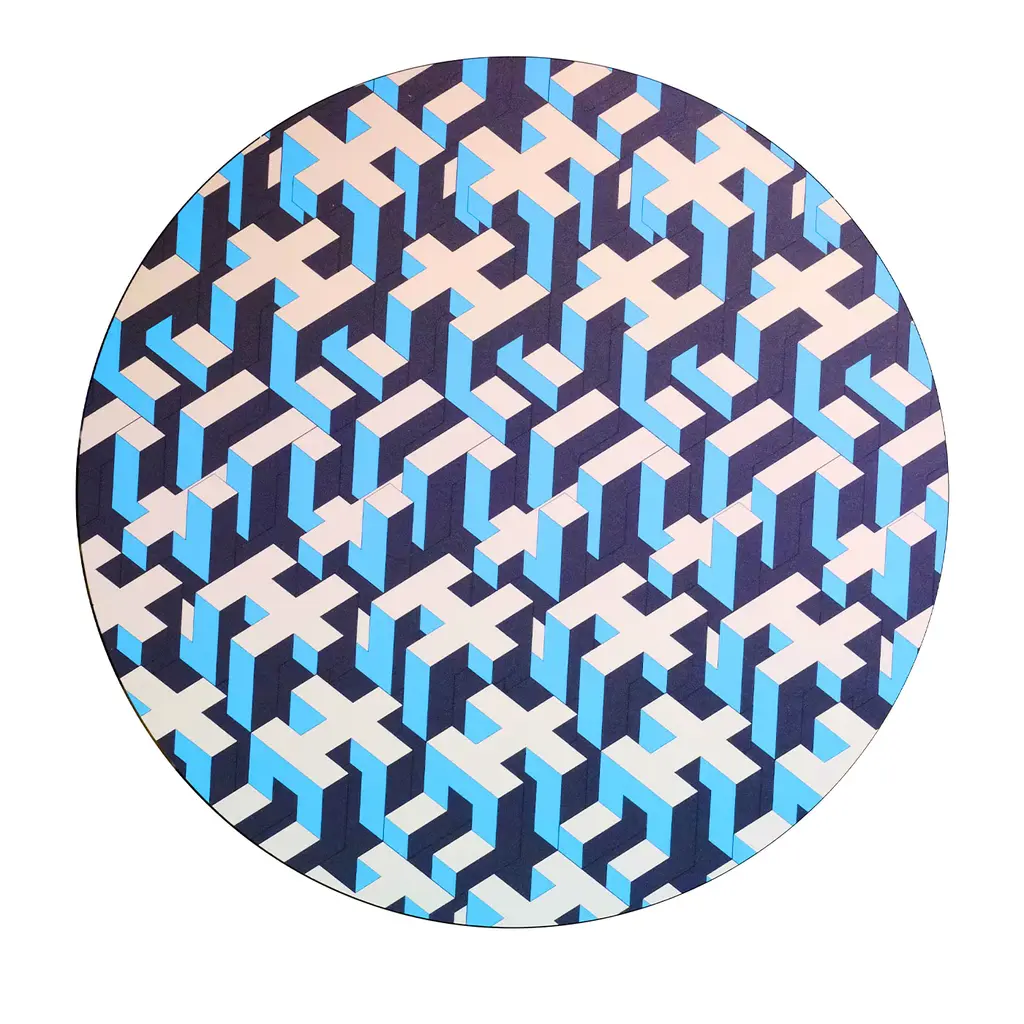 This circular painting is printed on a Dibond disc. Human Fabric is a series of works in which the archetypal "Prono" invented by the artist is multiplied in various positions to create a weave. The work's title is a paraphrase of "urban fabric"; in fact, it recalls a city seen from above, but the emphasis is on the relationship between individuals. The disc is spaced 1 cm from the wall. Limited Edition of 30.