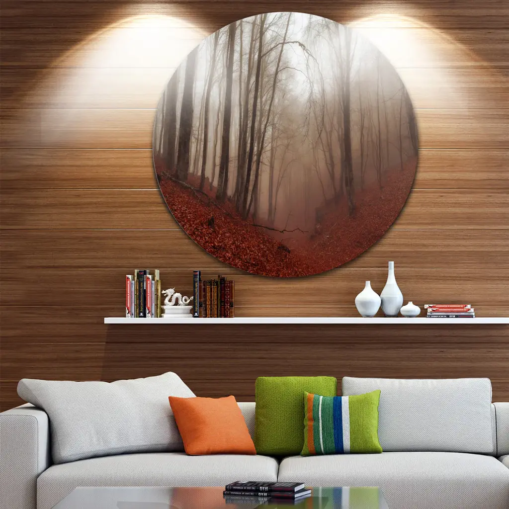 Bring Contemporary Abstraction to your home with this large Circle Metal wall art. This Red Leaves in Foggy Fall Forest Metal Artwork makes it the focal point of any room or office. - White Gloss Coating ensures colors are extra vibrant with light reflection.- Aluminum grade Sheet Metal with 1 inch mounting frame on the back giving the illusion that the artwork is floating on the wall..- Mounting Brackets are included along with instructions.- High Quality Digital images are created directly into a glossy aluminum panel producing a stunning and captivating print into the glossy finish of the metal.- Water, Fire and Scratch resistant HD Aluminum panels.- Looks better than any photo paper and guaranteed to last at least 20 years- Easy to clean with a microfiber cloth. Colors are far superior to regular Canvas Art. - Easy to Hang