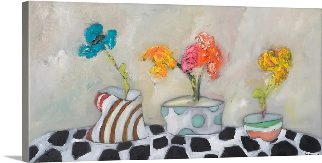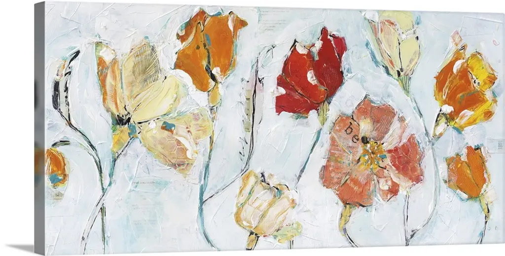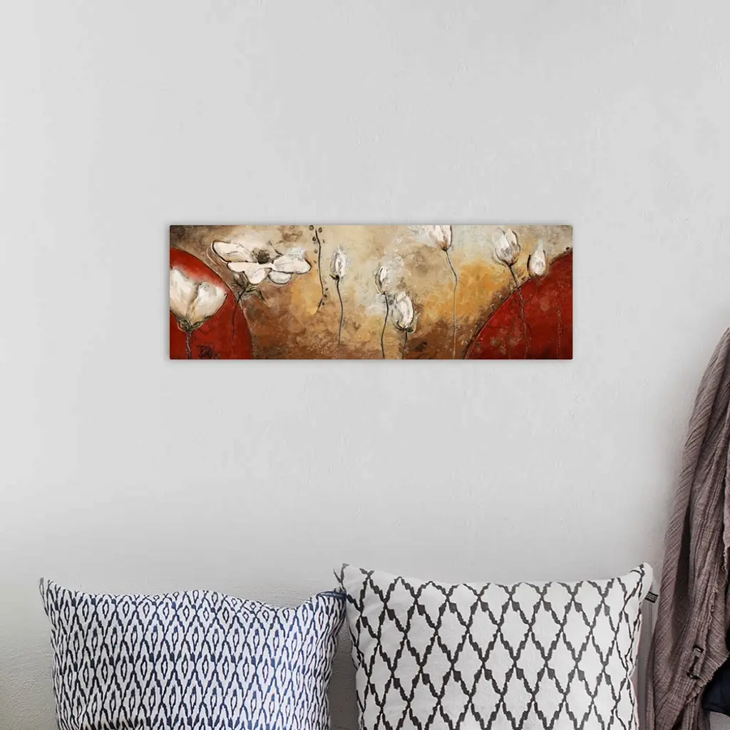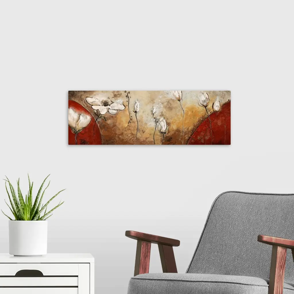 A panoramic painting of white flowers floating in the air with large red half circles on either side.