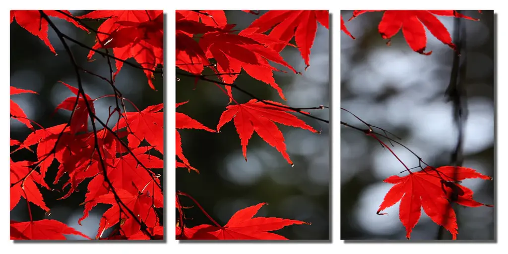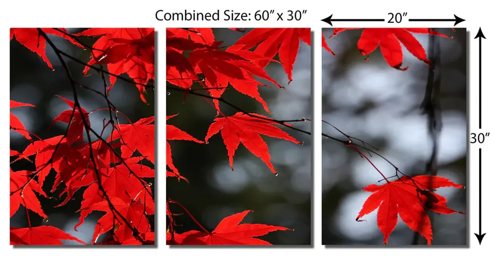 60"œ x 30"œ total size. Ready To Hang! (3 pieces - 20"œ x 30"œ each). 3 Panel Split (Triptych) Metal Print of bright red maple tree leaves on a b&W background. Modern metal wall art for home or office wall decor & interior design. Printed on Luxurious, HD aluminum glossy metal panels. Multi panel art.. HD aluminum panels. Metal print wall art. Includes Shadow Wall Mount on the back.• Aluminum Metal Wall Art• Made in USA• Ready to hang - No assembly required• Shadow mount hardware on the back• 0.045"œ thick HD Aluminum Panels• Scratch resistant, glossy finish• Superb color clarity, luxurious prints• Epson printing process• For indoor or moisture rich environment use• Easy to clean. Gently wipe with microfiber cloth.