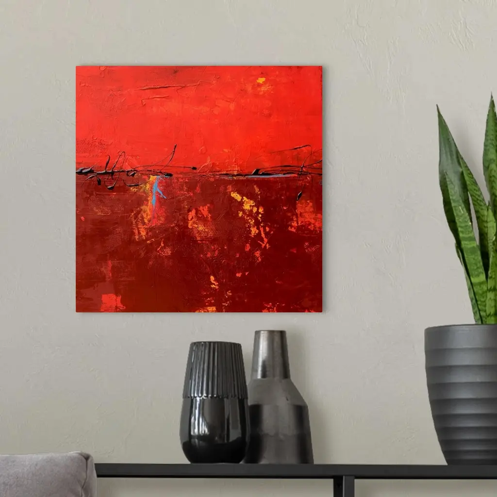 Square abstract painting on canvas with brush stroke textures overlaid on top.