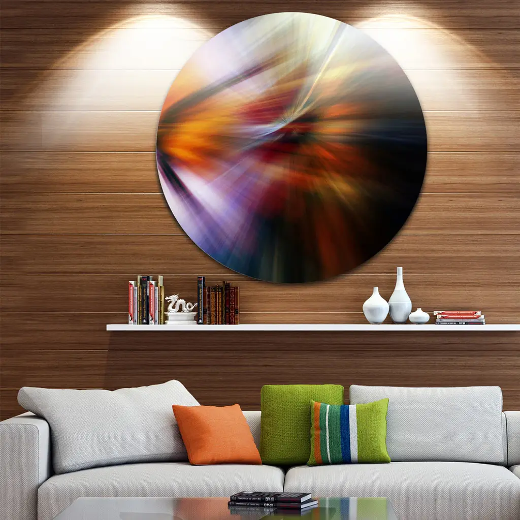Bring Contemporary Abstraction to your home with this large Circle Metal wall art. This Red Orange Fusion of Hues Metal Artwork makes it the focal point of any room or office. - White Gloss Coating ensures colors are extra vibrant with light reflection.- Aluminum grade Sheet Metal with 1 inch mounting frame on the back giving the illusion that the artwork is floating on the wall..- Mounting Brackets are included along with instructions.- High Quality Digital images are created directly into a glossy aluminum panel producing a stunning and captivating print into the glossy finish of the metal.- Water, Fire and Scratch resistant HD Aluminum panels.- Looks better than any photo paper and guaranteed to last at least 20 years- Easy to clean with a microfiber cloth. Colors are far superior to regular Canvas Art. - Easy to Hang