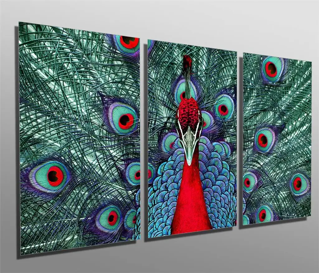 36"œ x 18"œ total size. Ready To Hang! (3 pieces - 12"œ x 18"œ each). 3 Panel Split (Triptych) Red Peacock photo Metal Print. Modern metal wall art for home or office wall decor & interior design. Printed on Luxurious, HD aluminum glossy metal panels. Multi panel art.. HD aluminum panels. Metal print wall art. Includes Shadow Wall Mount on the back.• Aluminum Metal Wall Art• Made in USA• Ready to hang - No assembly required• Shadow mount hardware on the back• 0.045"œ thick HD Aluminum Panels• Scratch resistant, glossy finish• Superb color clarity, luxurious prints• Epson printing process• For indoor or moisture rich environment use• Easy to clean. Gently wipe with microfiber cloth.