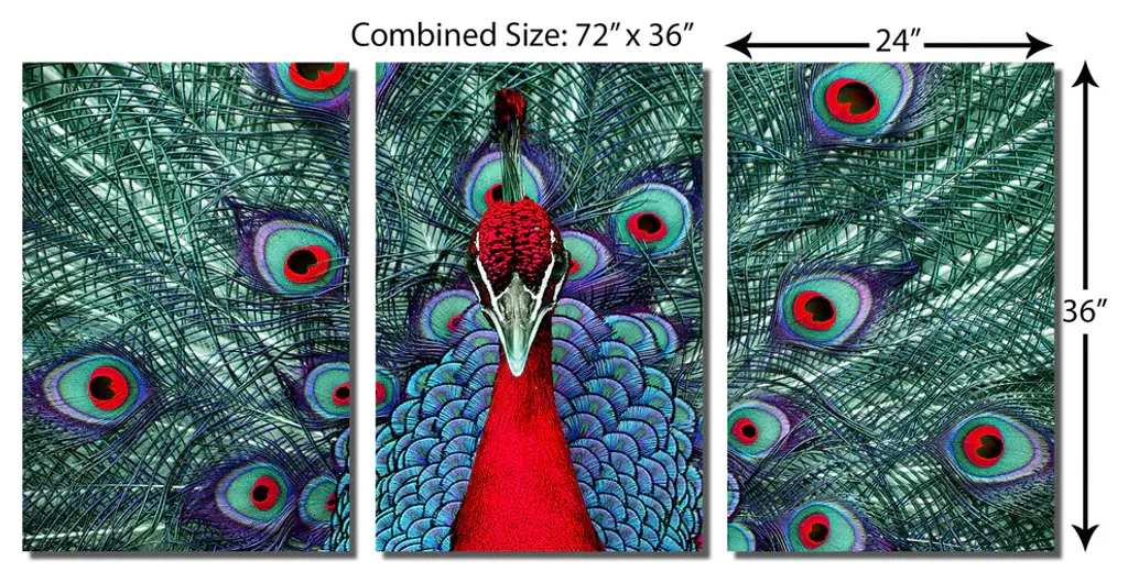 72"œ x 36"œ total size. Ready To Hang! (3 pieces - 24"œ x 36"œ each). 3 Panel Split (Triptych) Red Peacock photo Metal Print. Modern metal wall art for home or office wall decor & interior design. Printed on Luxurious, HD aluminum glossy metal panels. Multi panel art.. HD aluminum panels. Metal print wall art. Includes Shadow Wall Mount on the back.• Aluminum Metal Wall Art• Made in USA• Ready to hang - No assembly required• Shadow mount hardware on the back• 0.045"œ thick HD Aluminum Panels• Scratch resistant, glossy finish• Superb color clarity, luxurious prints• Epson printing process• For indoor or moisture rich environment use• Easy to clean. Gently wipe with microfiber cloth.