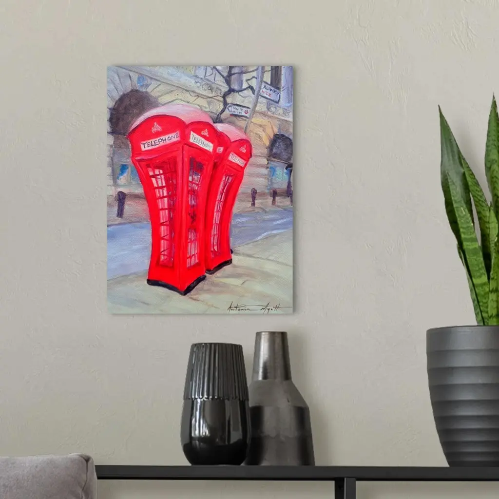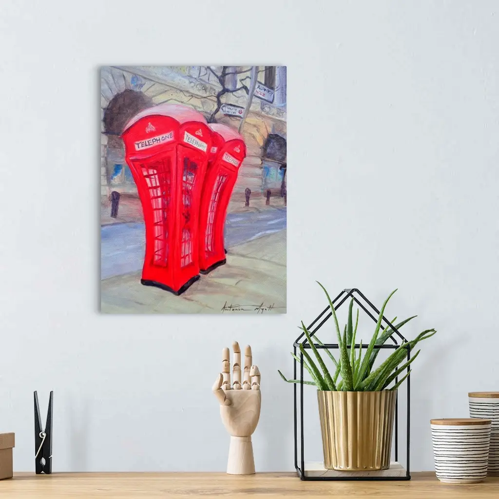 Large oil painting of two telephone booths in London with buildings and a street in the background.