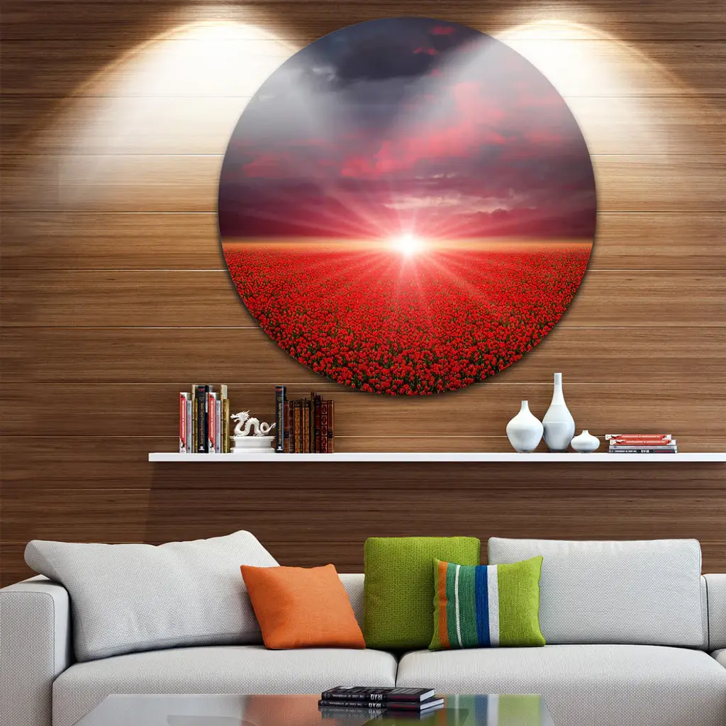 Red Poppies Field At Sunset, Modern Landscape Disc Metal Wall Art, 23"
