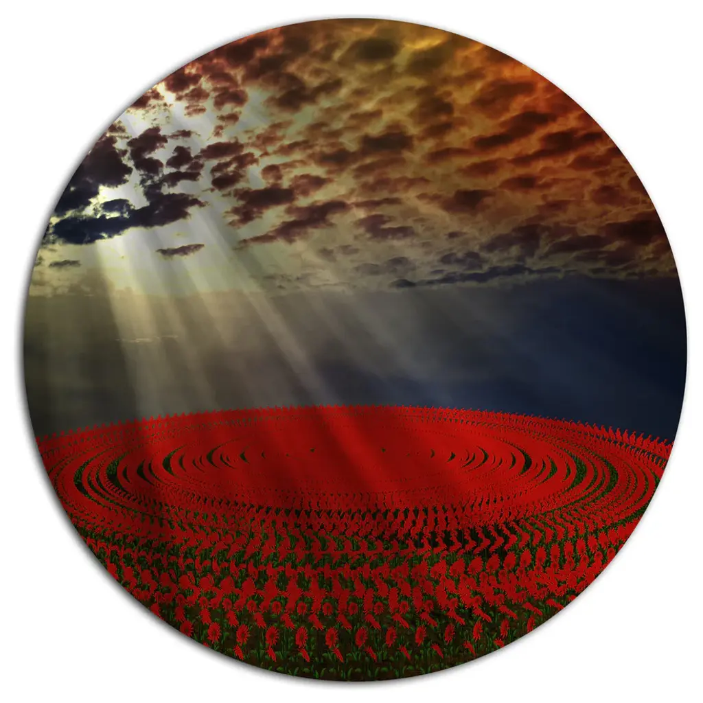 Bring Contemporary Abstraction to your home with this large Circle Metal wall art. This Red Poppies Field at Sunset Metal Artwork makes it the focal point of any room or office. - White Gloss Coating ensures colors are extra vibrant with light reflection.- Aluminum grade Sheet Metal with 1 inch mounting frame on the back giving the illusion that the artwork is floating on the wall..- Mounting Brackets are included along with instructions.- High Quality Digital images are created directly into a glossy aluminum panel producing a stunning and captivating print into the glossy finish of the metal.- Water, Fire and Scratch resistant HD Aluminum panels.- Looks better than any photo paper and guaranteed to last at least 20 years- Easy to clean with a microfiber cloth. Colors are far superior to regular Canvas Art. - Easy to Hang