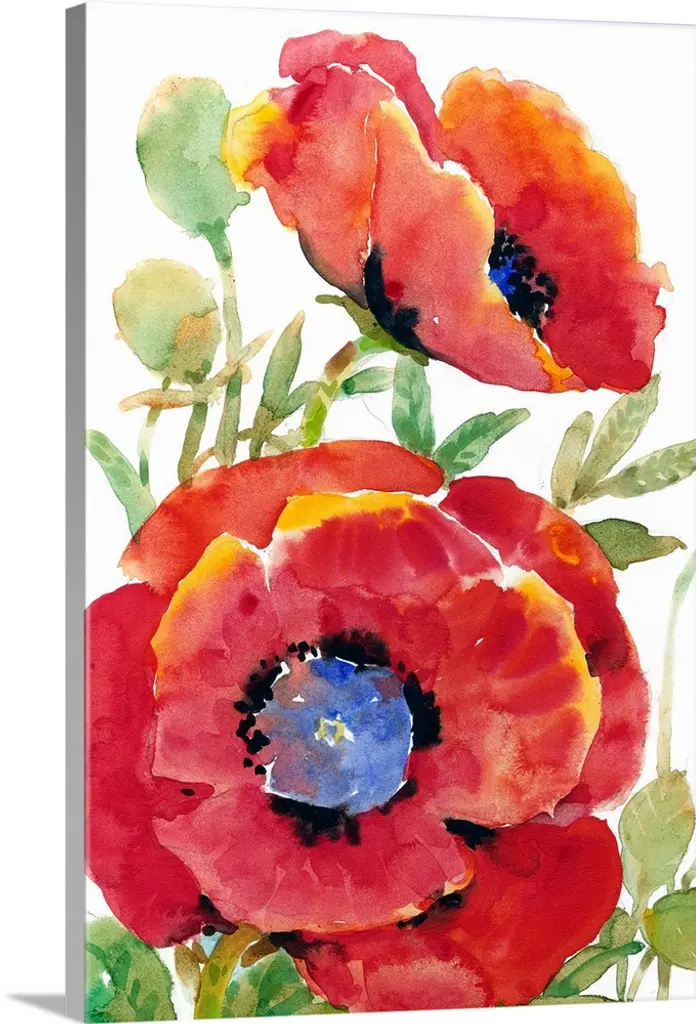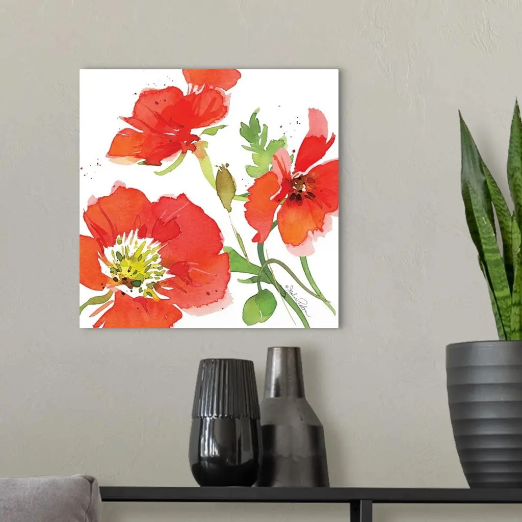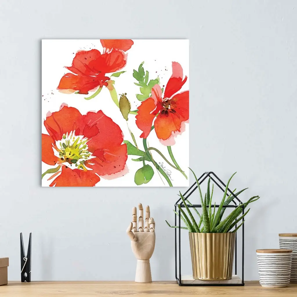 Square watercolor painting of red poppies on a white background with a little bit of red paint splatter.