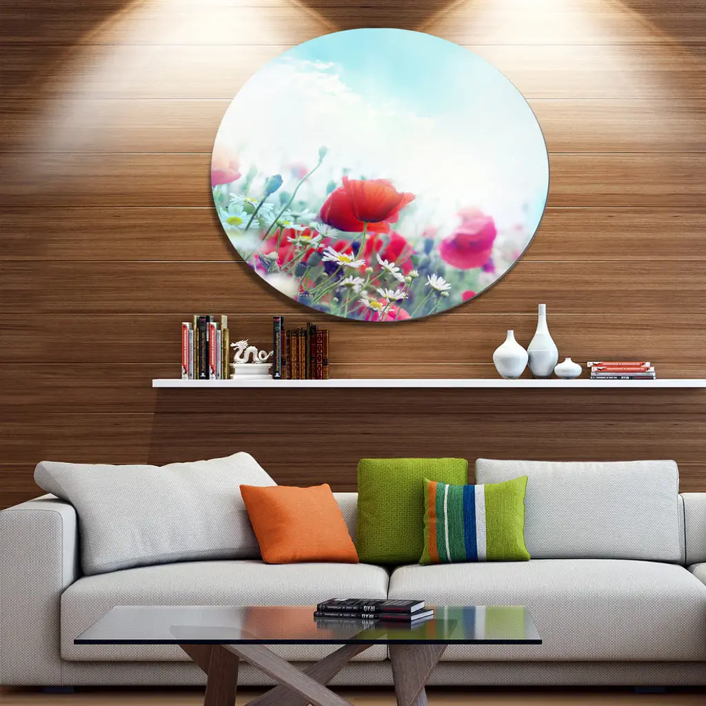 Bring Contemporary Abstraction to your home with this large Circle Metal wall art. This Red Poppies on Blue Background Metal Artwork makes it the focal point of any room or office. - White Gloss Coating ensures colors are extra vibrant with light reflection.- Aluminum grade Sheet Metal with 1 inch mounting frame on the back giving the illusion that the artwork is floating on the wall..- Mounting Brackets are included along with instructions.- High Quality Digital images are created directly into a glossy aluminum panel producing a stunning and captivating print into the glossy finish of the metal.- Water, Fire and Scratch resistant HD Aluminum panels.- Looks better than any photo paper and guaranteed to last at least 20 years- Easy to clean with a microfiber cloth. Colors are far superior to regular Canvas Art. - Easy to Hang