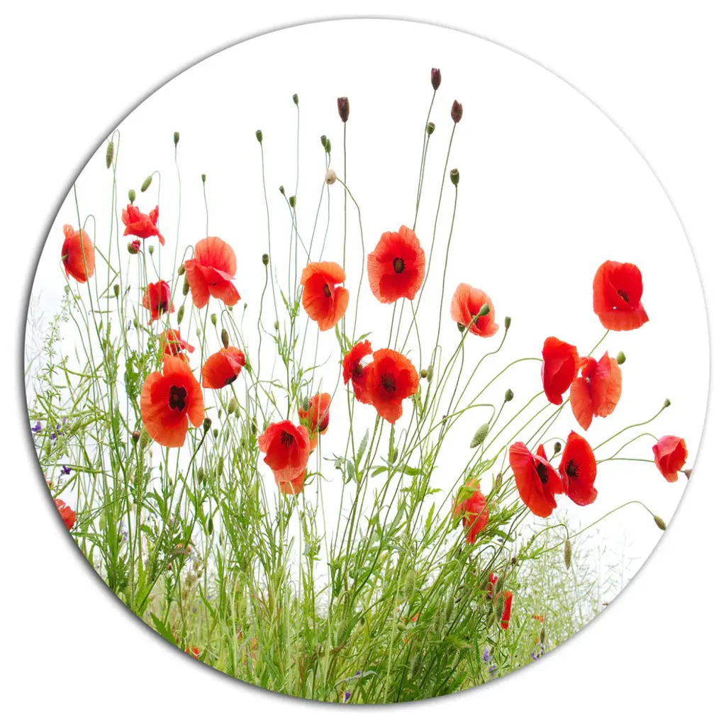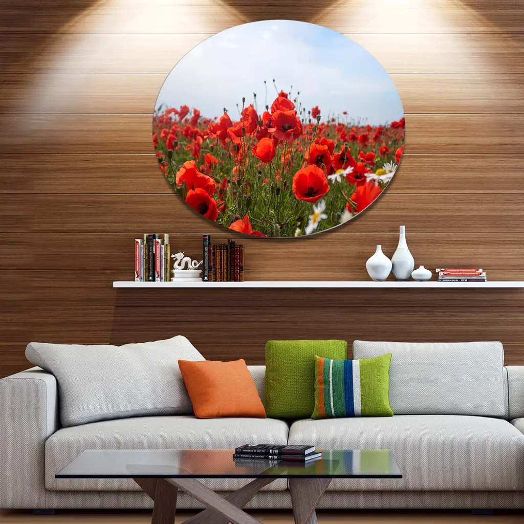 Bring Contemporary Abstraction to your home with this large Circle Metal wall art. This Red Poppies under Bright Blue Sky Metal Artwork makes it the focal point of any room or office. - White Gloss Coating ensures colors are extra vibrant with light reflection.- Aluminum grade Sheet Metal with 1 inch mounting frame on the back giving the illusion that the artwork is floating on the wall..- Mounting Brackets are included along with instructions.- High Quality Digital images are created directly into a glossy aluminum panel producing a stunning and captivating print into the glossy finish of the metal.- Water, Fire and Scratch resistant HD Aluminum panels.- Looks better than any photo paper and guaranteed to last at least 20 years- Easy to clean with a microfiber cloth. Colors are far superior to regular Canvas Art. - Easy to Hang