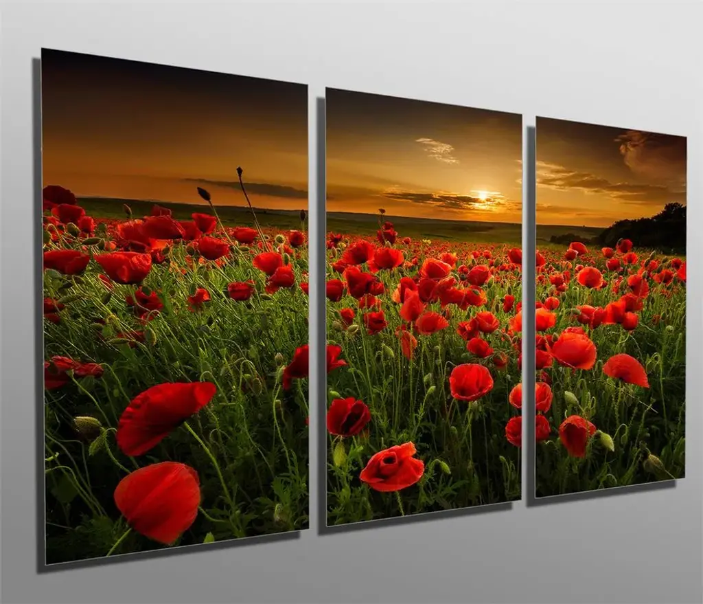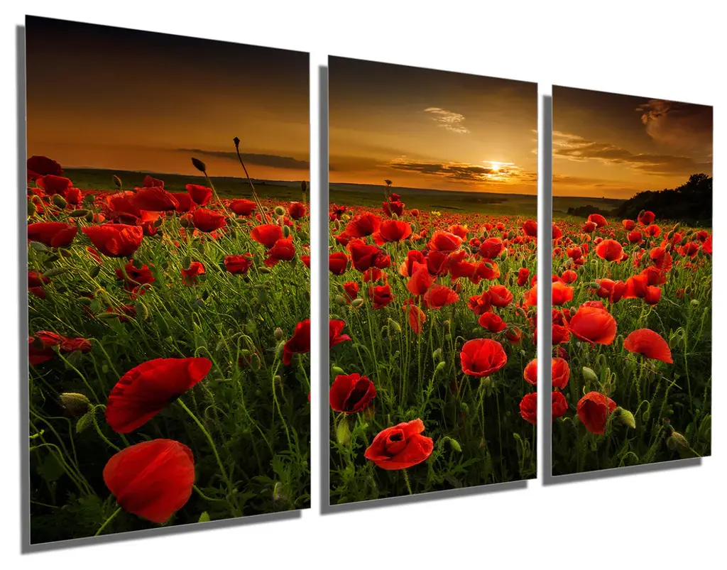 48"œ x 24"œ total size. Ready To Hang! (3 pieces - 16"œ x 24"œ each). 3 Panel Split (Triptych) Metal Print featuring Red Poppy field at sunset. Modern metal wall art for home or office wall decor & interior design. Printed on Luxurious, HD aluminum glossy metal panels. Multi panel art.. HD aluminum panels. Metal print wall art. Includes Shadow Wall Mount on the back.• Aluminum Metal Wall Art• Made in USA• Ready to hang - No assembly required• Shadow mount hardware on the back• 0.045"œ thick HD Aluminum Panels• Scratch resistant, glossy finish• Superb color clarity, luxurious prints• Epson printing process• For indoor or moisture rich environment use• Easy to clean. Gently wipe with microfiber cloth.