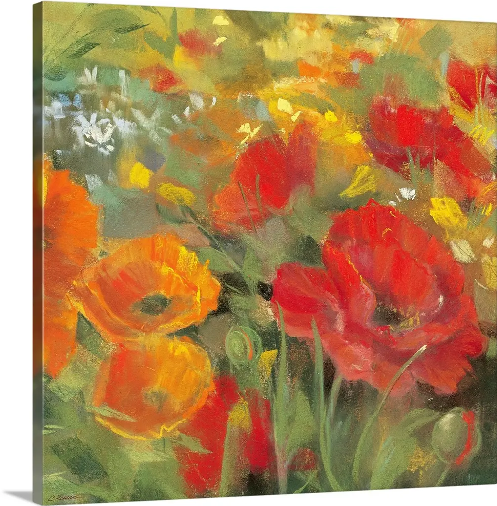 Contemporary painting of several bright poppy flowers growing in the wild.