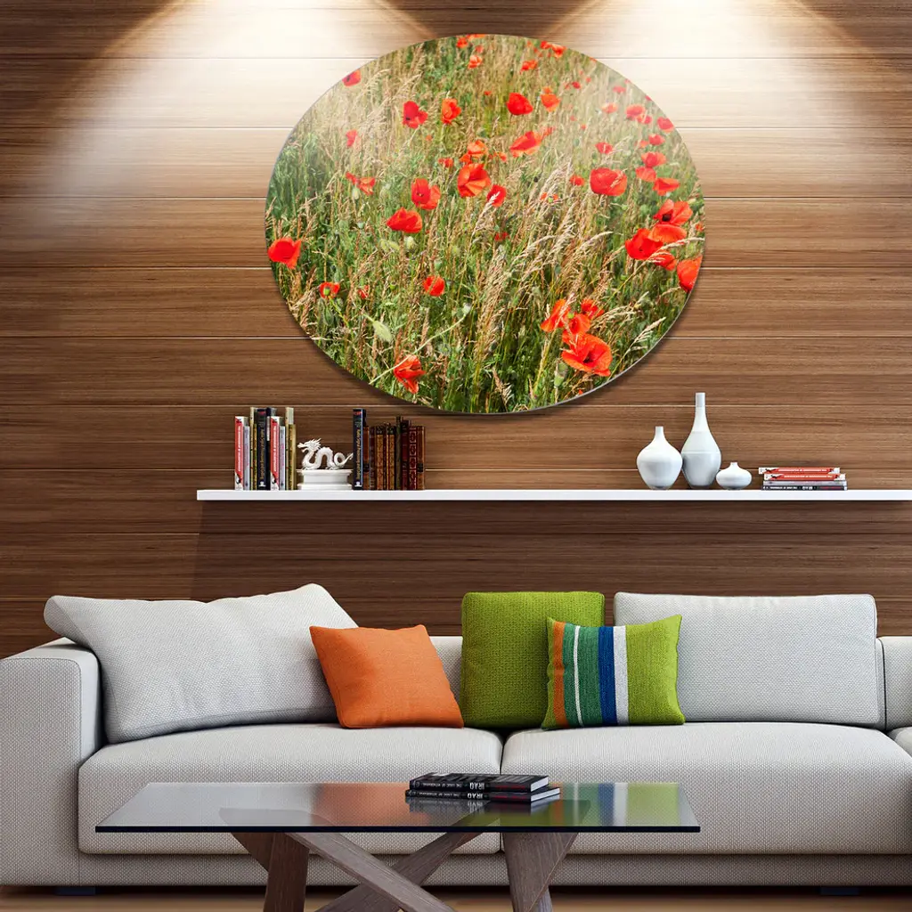 Red Poppy Field With Full Of Flowers, Flower Round Metal Wall Art, 36"