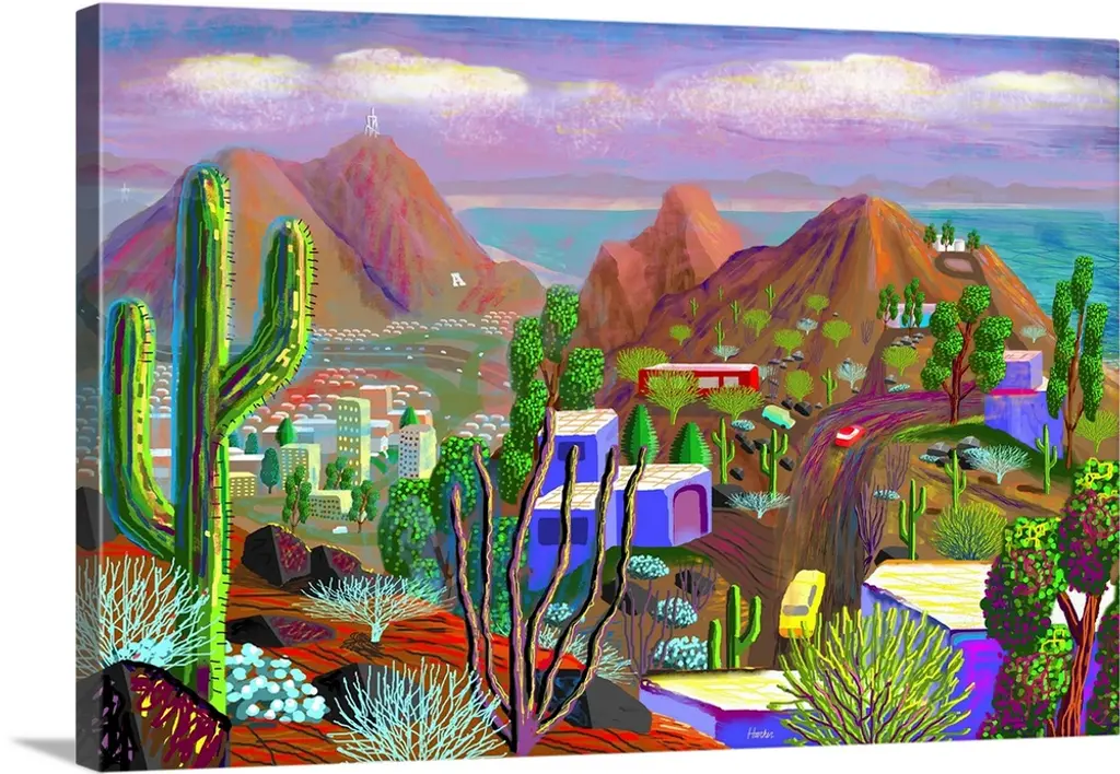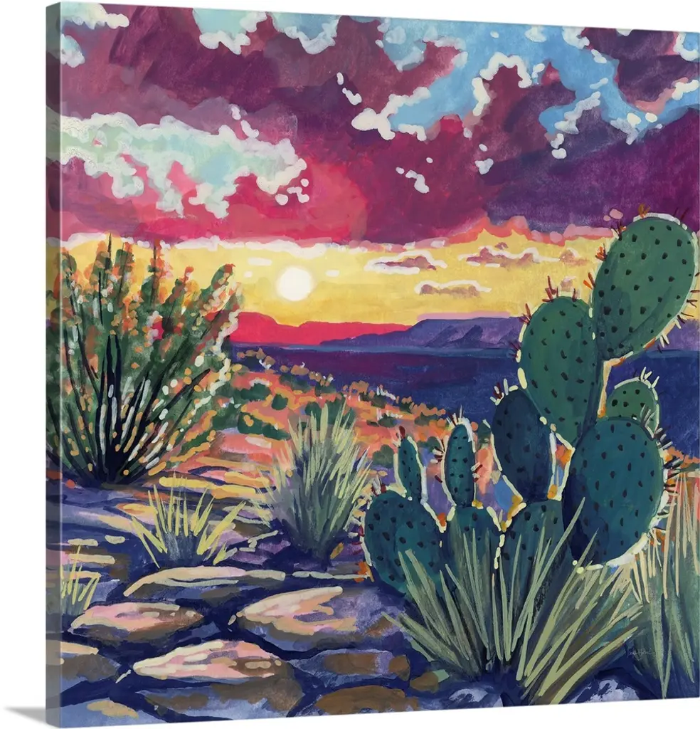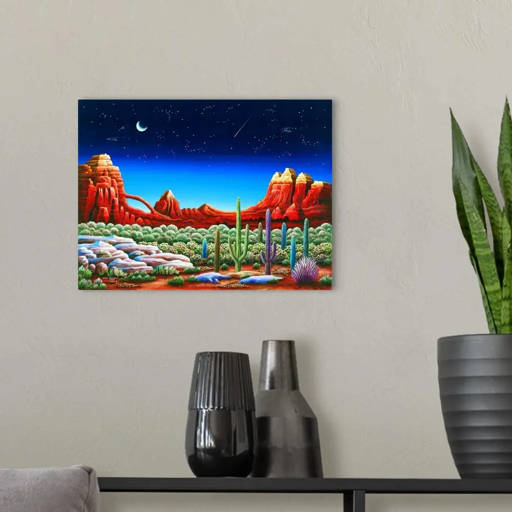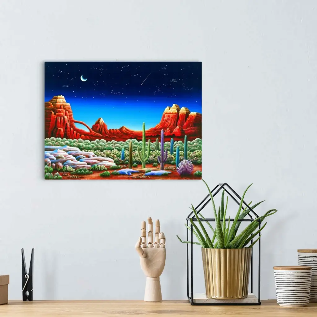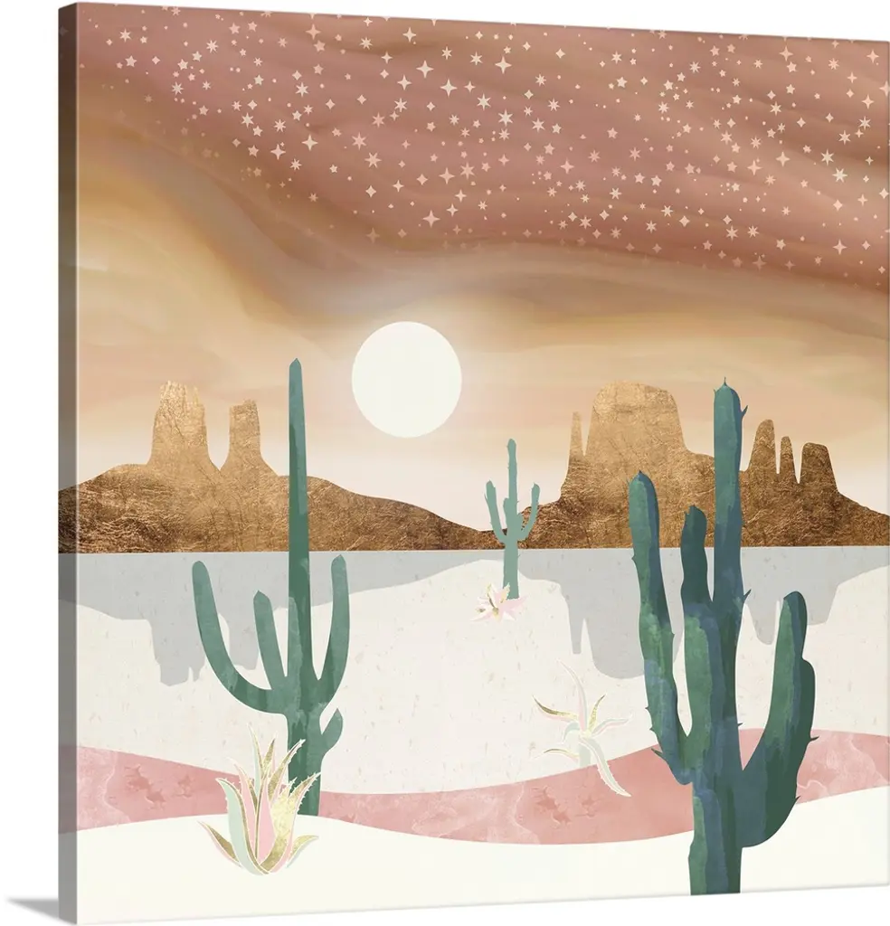 Painting of a desert landscape under a starry night sky.