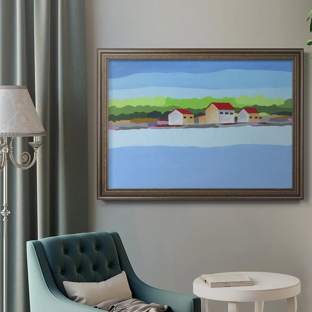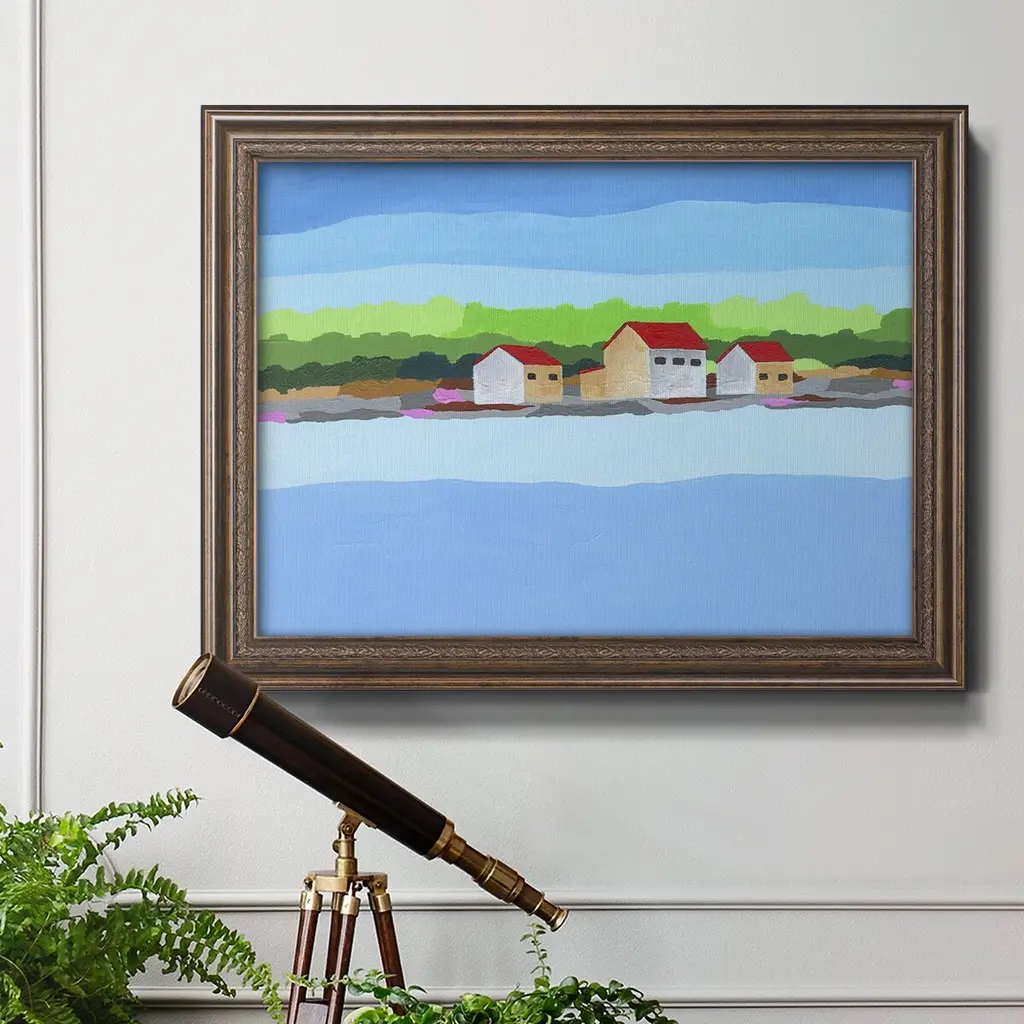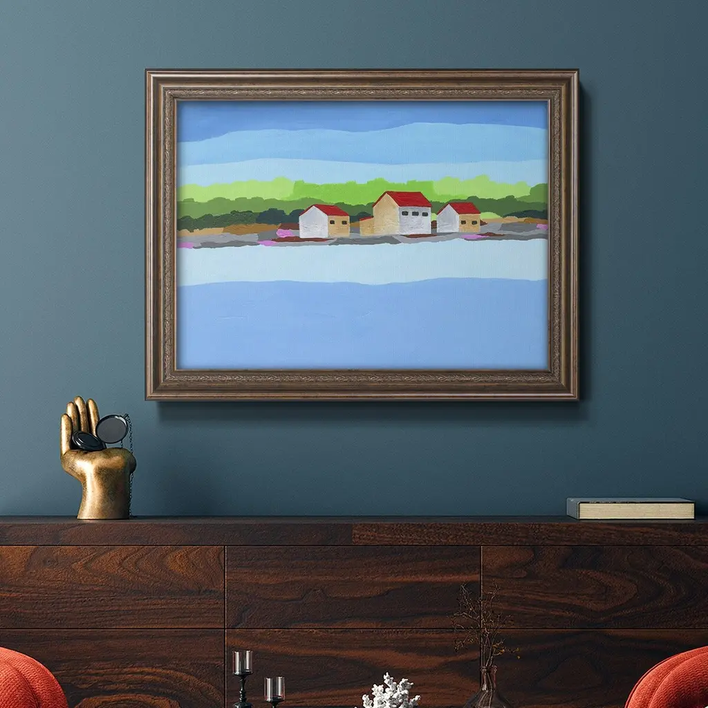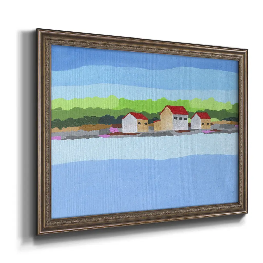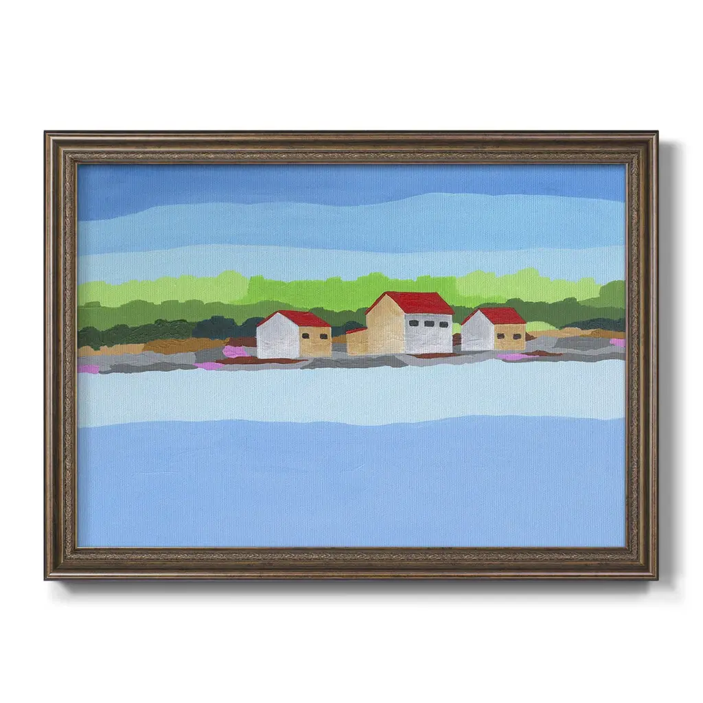 Red Roof Landscape II Premium Framed Canvas- Ready to Hang A Premium Framed Canvas created to last. Framed in distressed wood and available in an array of sizes and colors Featuring a beveled a solid wood stretcher bar, each piece comes ready to hand 3 SIZES AVAILABLE 16''X20'' - Overall Size 18'X27'' - Overall Size 24''x36'' - Overall Size Each piece is made to order. Each piece comes with hanging hardware. Made in the USA Ready to Hang Giclee Paper Print Acrylic Glass Beveled Matt Board