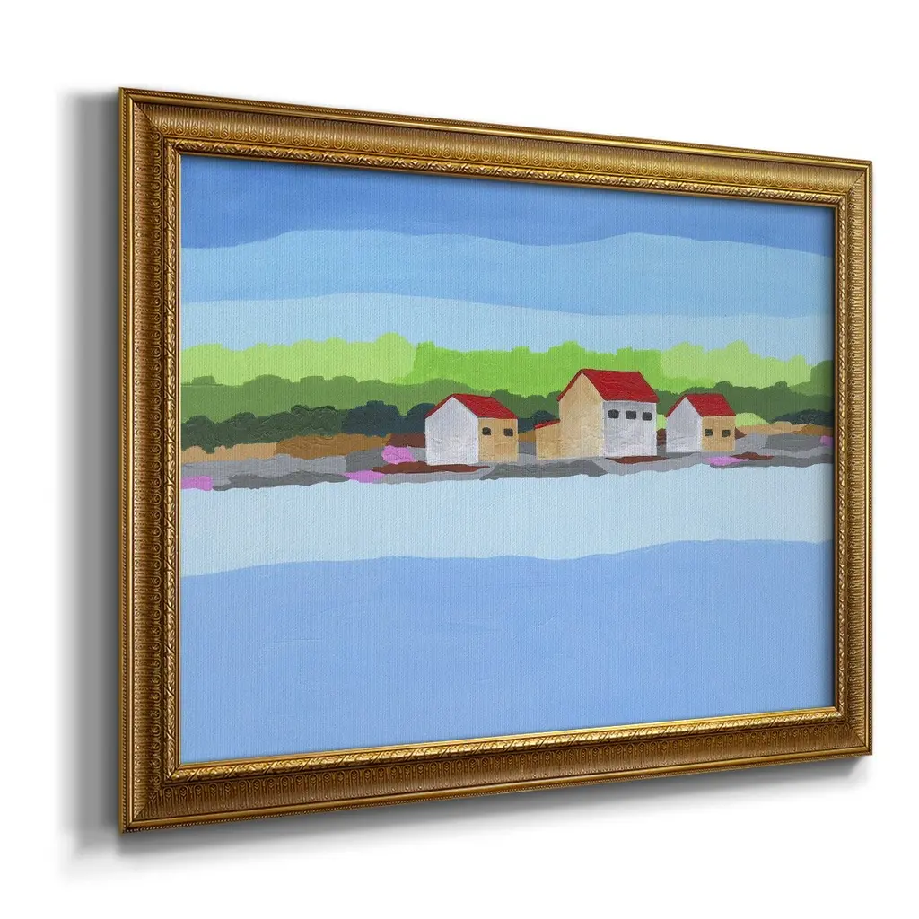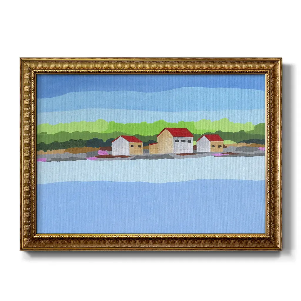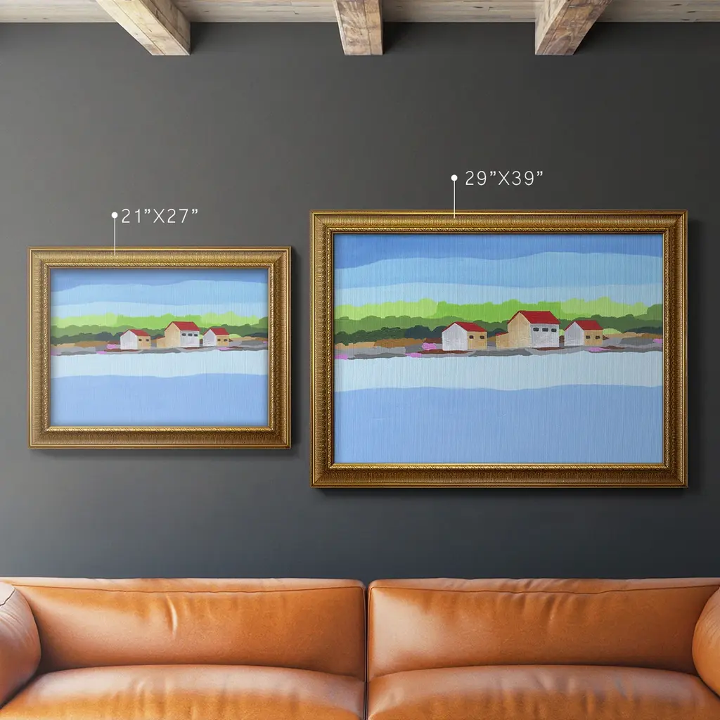Red Roof Landscape II Premium Framed Canvas- Ready to Hang A Premium Framed Canvas created to last. Framed in distressed wood and available in an array of sizes and colors Featuring a beveled a solid wood stretcher bar, each piece comes ready to hand 3 SIZES AVAILABLE 16''X20'' - Overall Size 18'X27'' - Overall Size 24''x36'' - Overall Size Each piece is made to order. Each piece comes with hanging hardware. Made in the USA Ready to Hang Giclee Paper Print Acrylic Glass Beveled Matt Board