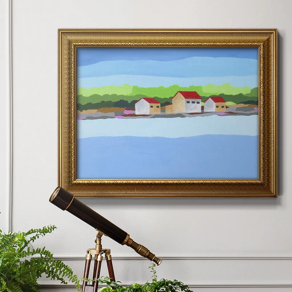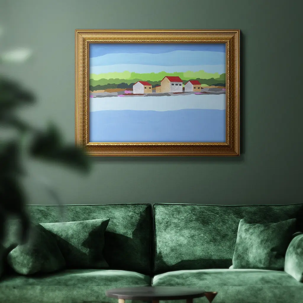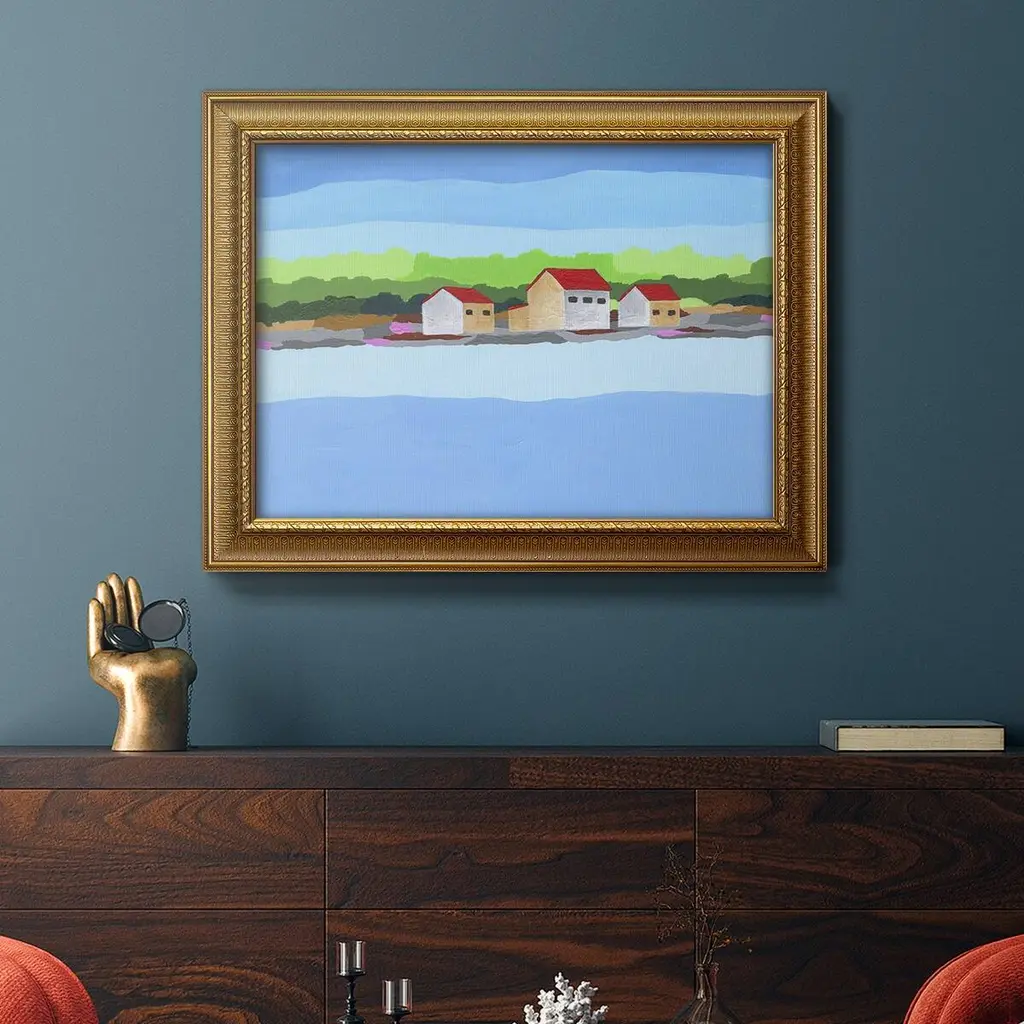 Red Roof Landscape II Premium Framed Canvas- Ready to Hang A Premium Framed Canvas created to last. Framed in distressed wood and available in an array of sizes and colors Featuring a beveled a solid wood stretcher bar, each piece comes ready to hand 3 SIZES AVAILABLE 16''X20'' - Overall Size 18'X27'' - Overall Size 24''x36'' - Overall Size Each piece is made to order. Each piece comes with hanging hardware. Made in the USA Ready to Hang Giclee Paper Print Acrylic Glass Beveled Matt Board