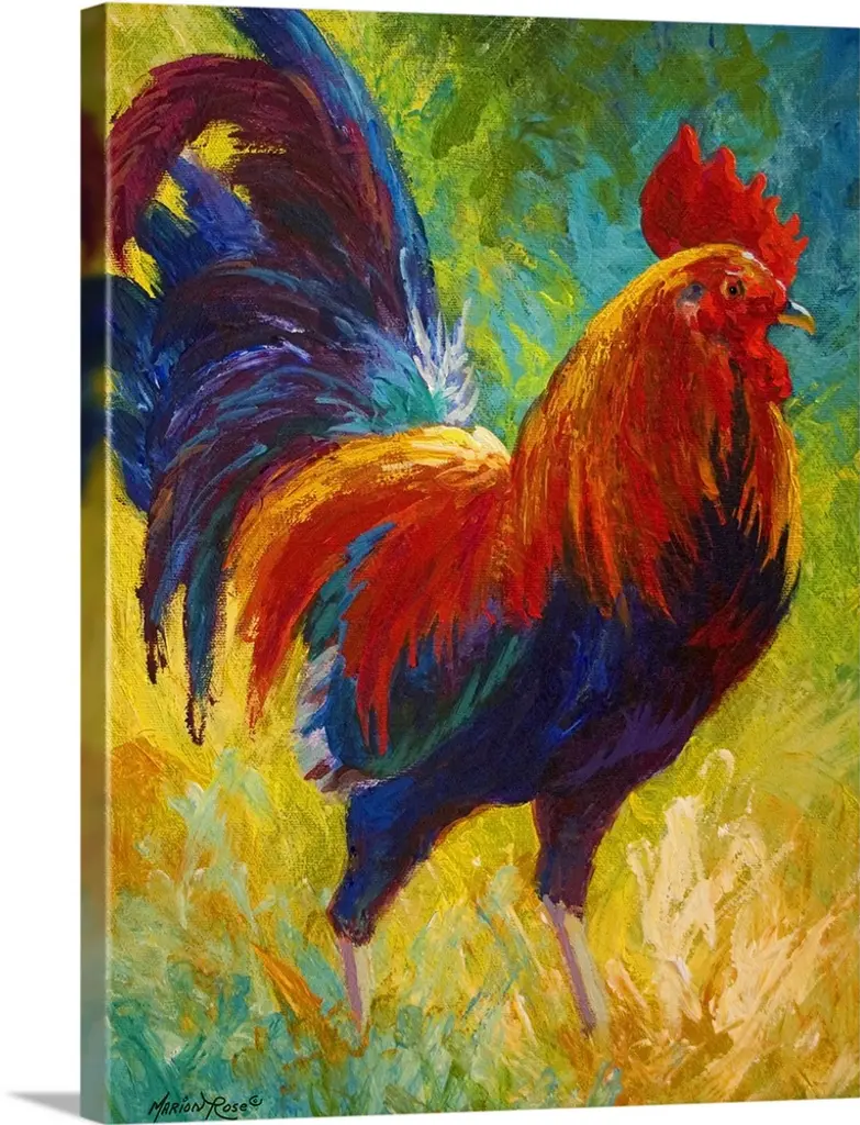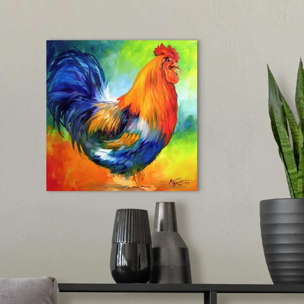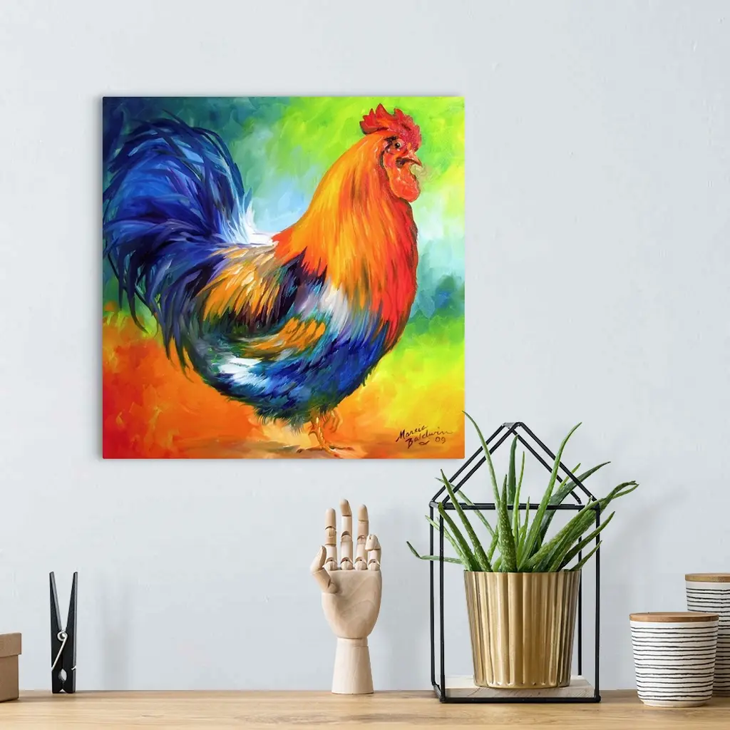 Square painting of a red, orange, and blue rooster on a colorful background.