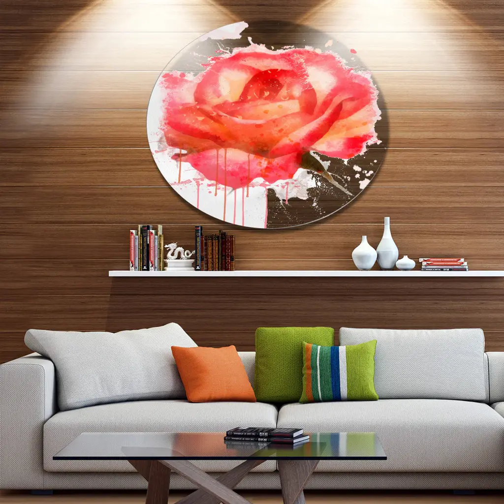 Red Rose Hand-Drawn With Splashes, Floral Disc Metal Artwork, 11"
