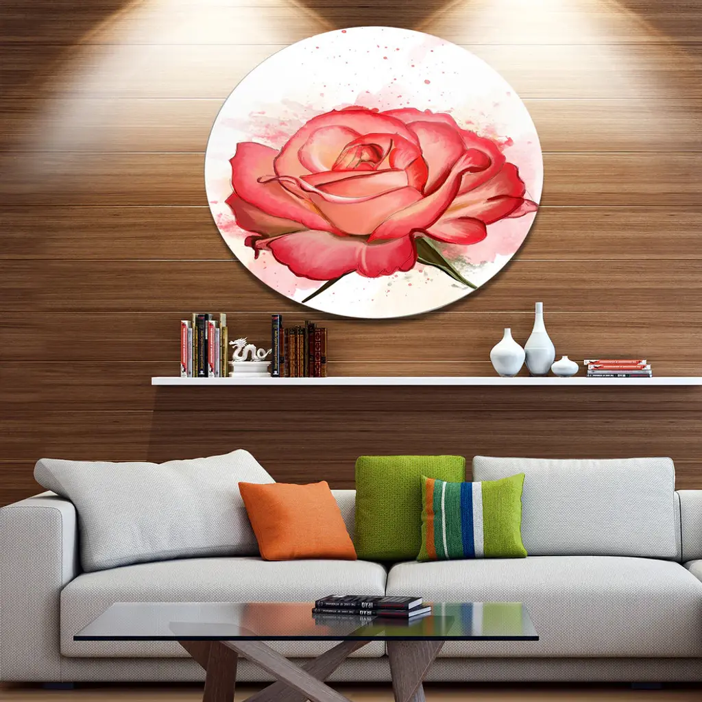 Red Rose Illustration With Splashes, Floral Round Metal Wall Art, 23"
