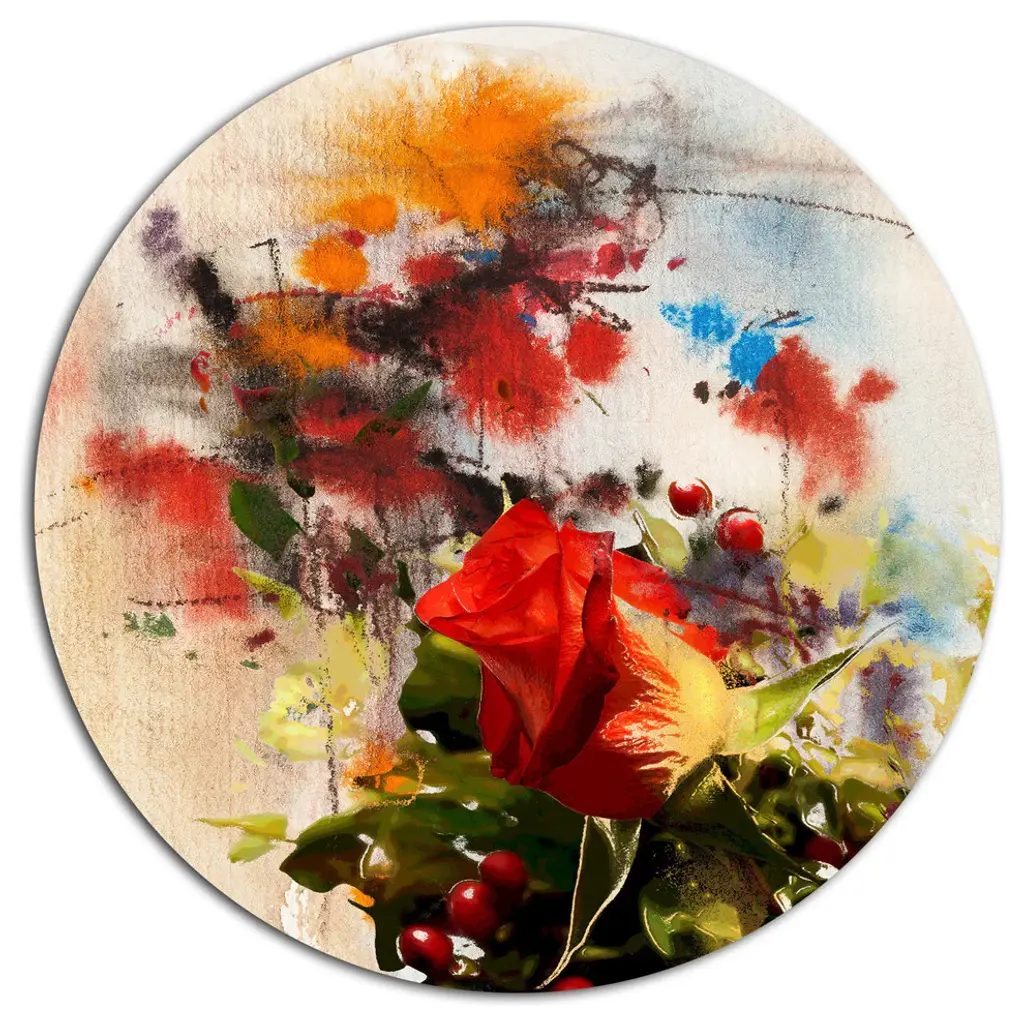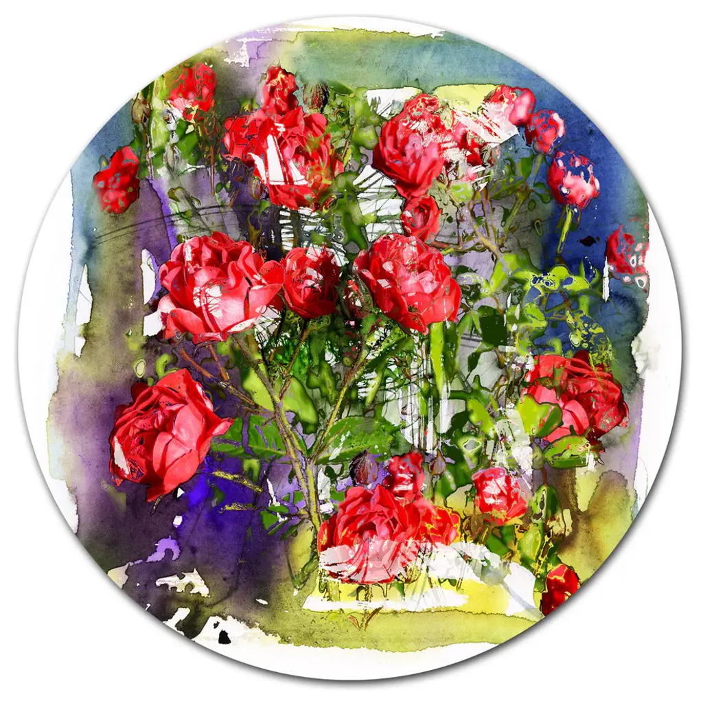 Bring Contemporary Abstraction to your home with this large Circle Metal wall art. This Large Red Roses Composition Metal Artwork makes it the focal point of any room or office. - White Gloss Coating ensures colors are extra vibrant with light reflection.- Aluminum grade Sheet Metal with 1 inch mounting frame on the back giving the illusion that the artwork is floating on the wall..- Mounting Brackets are included along with instructions.- High Quality Digital images are created directly into a glossy aluminum panel producing a stunning and captivating print into the glossy finish of the metal.- Water, Fire and Scratch resistant HD Aluminum panels.- Looks better than any photo paper and guaranteed to last at least 20 years- Easy to clean with a microfiber cloth. Colors are far superior to regular Canvas Art. - Easy to Hang