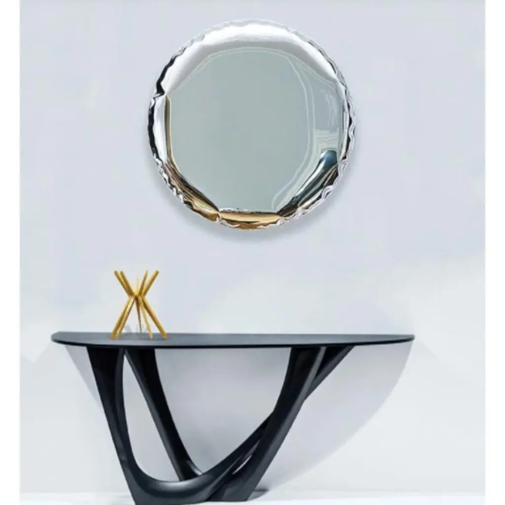 Red Rubin Oko 36 sculptural wall mirror by ZietaDimensions: Diameter 36 x D 6 cm Material: Stainless steel. Finish: Red Rubin.Available in finishes: Stainless Steel, Deep Space Blue, Emerald, Sapphire, Sapphire/Emerald, Dark Matter, and Red Rubin. Also available in different sizes: ø 36, ø 62, ø 75, ø95 and, ø 120cm. Round-shaped mirrors are classic elements of elegant interior design. The OKO mirror by Zieta Studio is a mysterious steel object with a reflective surface. It is available in numerous versions: diverse sizes and lacquered finishes. The OKO Ruby Red & OKO Dark Matter mirrors from the Transitions Collection resemble noble gemstones – the mixture of red and black colors gives it an intriguing character.The colors of the superb Transitions Collection, black and red that fade and intensify depending on the point of view, infiltrate each other and generate fantastical reflections of the surroundings. Thanks to its finish, the OKO mirror’s minimalist form gains an opulent aspect. It will fit interiors arranged in a generously classical style.The distorted edges of the mirror are the effect of the manufacturing method Zieta Studio applies in their collection of wall decor. Called FiDU technology, it is based on joining two pieces of steel, which then gain a third dimension in the process of inflating into tridimensional objects with compressed air.About Zieta: Zietas main goal is to deliver uniqueness and customization in design and construction while keeping the production, transport, and warehousing innovatively efficient.This is how they imagine the future world: Light, durable structures of customized applications produced on demand out of one-of-a-kind parts, yet efficiently.They use a computer-controlled production process. Customized pattern, customized form, customized function, one-of-a-kind product, and outstanding precision are what they deliver.You will find all of this philosophy reflected in the products. The research, they discover new possibilities, they play with forms and they deliver a beautiful, innovative, surprising outcome to people who love the design and who care about design development.They believe their work is a valuable contribution to the world of design not only by the unique beauty of the forms but most of all by opening ultra-innovative opportunities of forming and new paths for the world of the future.