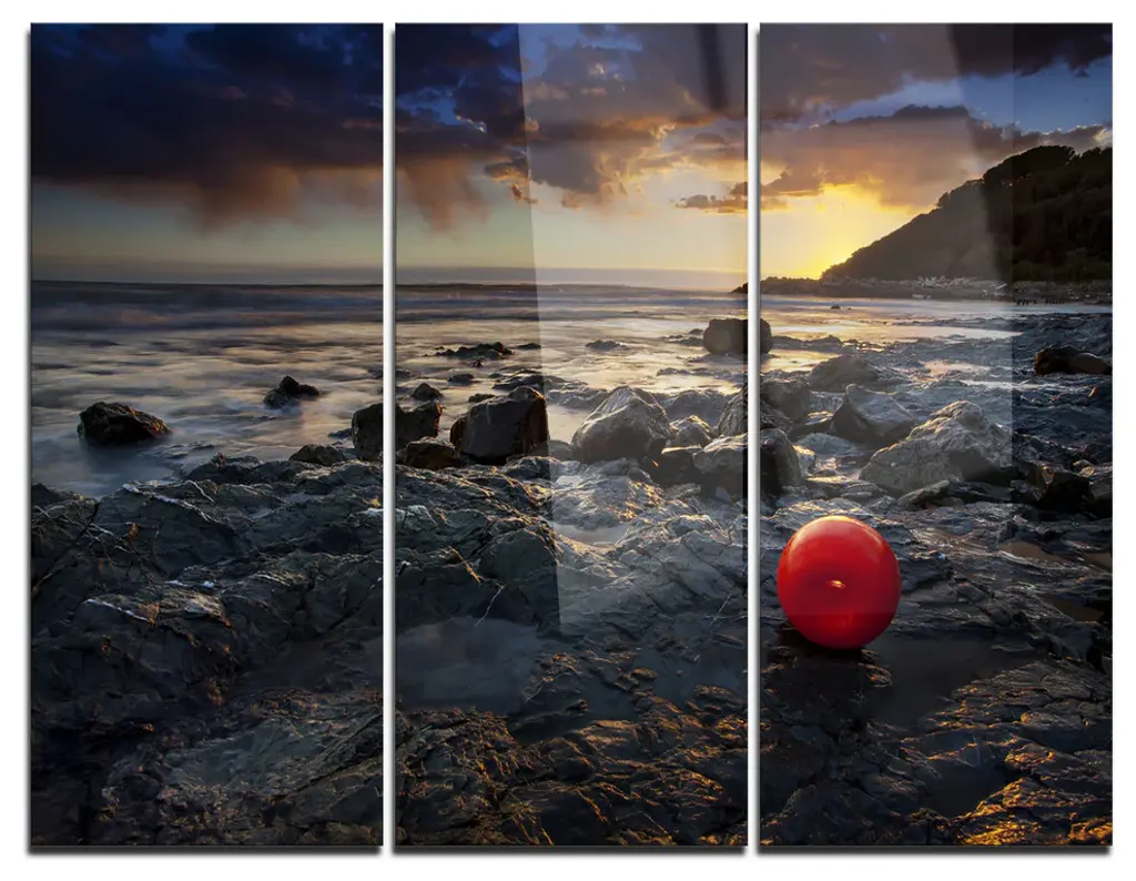 "Red Sky Over Rocky Seashore" Photography Metal Wall Art, 3 Panels, 36"x28"