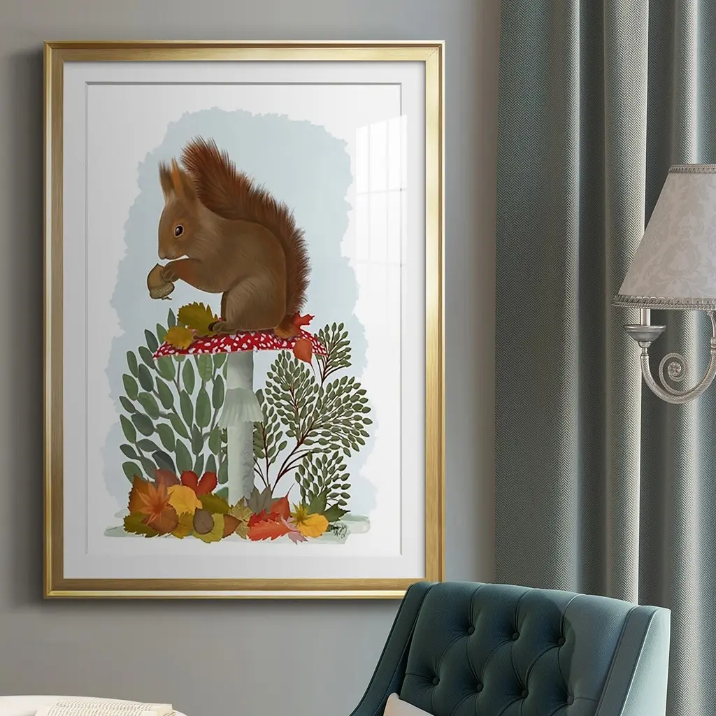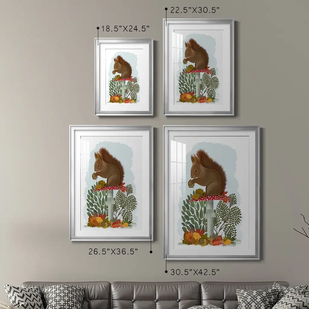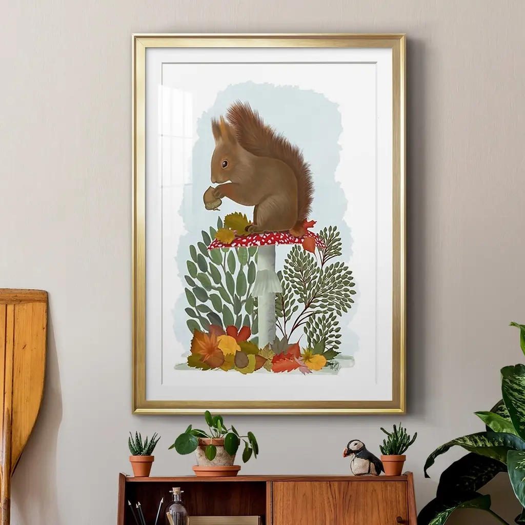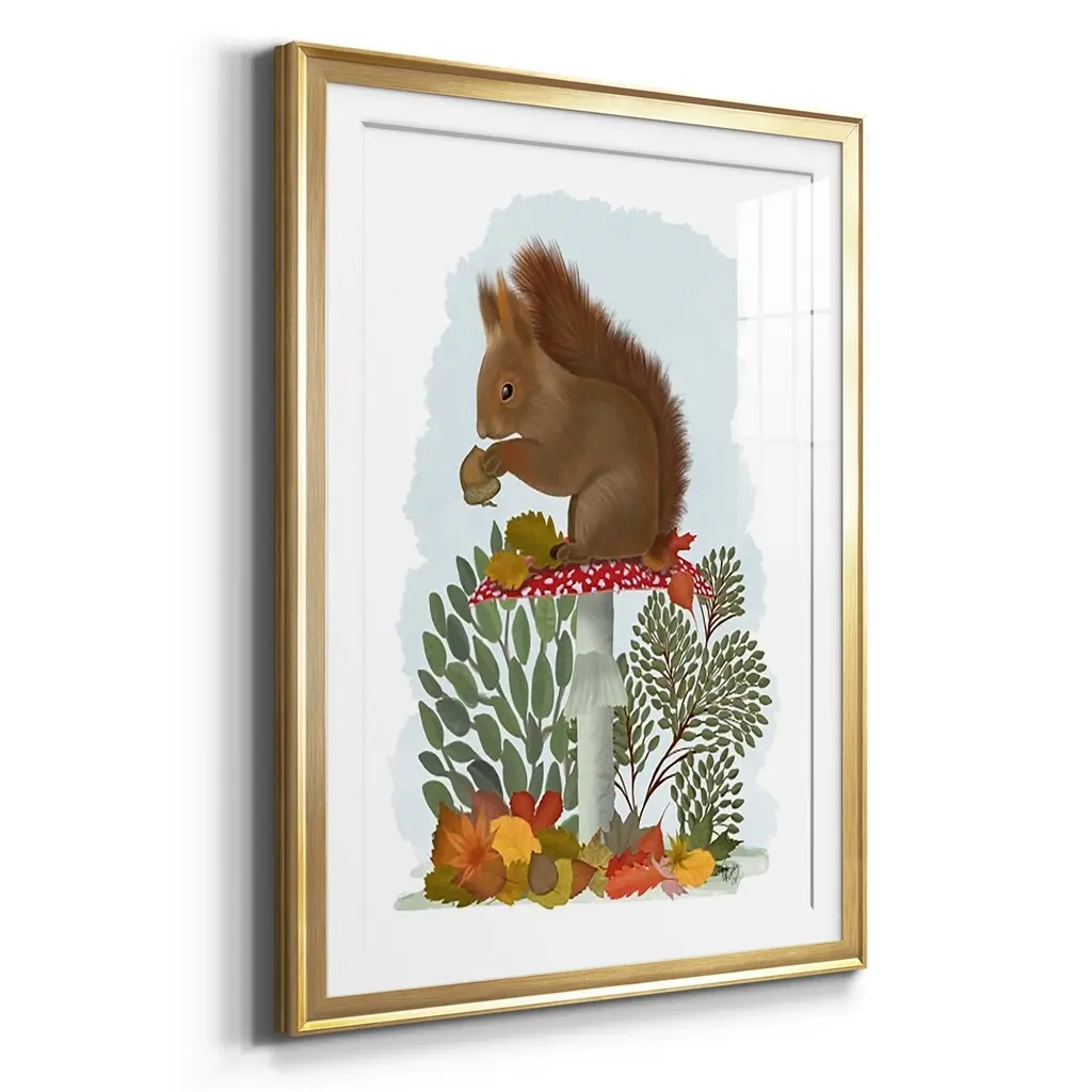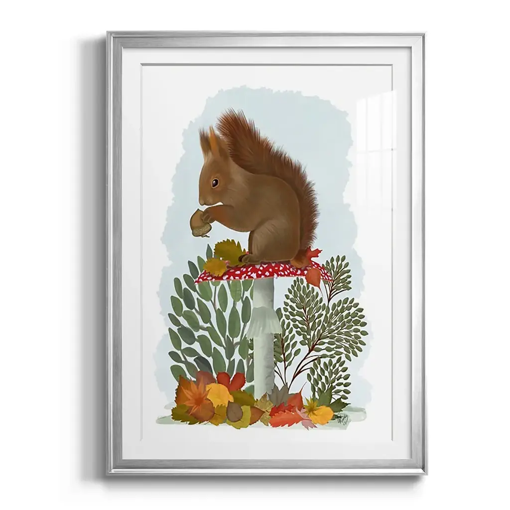 Red Squirrel On Mushroom Premium Framed Print - Ready to Hang A Premium Framed Print created to last. Framed in distressed wood and available in an array of sizes and colors Featuring a beveled a solid wood stretcher bar, each piece comes ready to hand 4 SIZES AVAILABLE 30.5''X42.5'' - Overall Size 26.5'X36.5'' - Overall Size 22.5''x30.5'' - Overall Size 18.5''x24.5'' - Overall Size Each piece is made to order. Each piece comes with hanging hardware. Made in the USA Ready to Hang Giclee Paper Print Acrylic Glass Beveled Matt Board