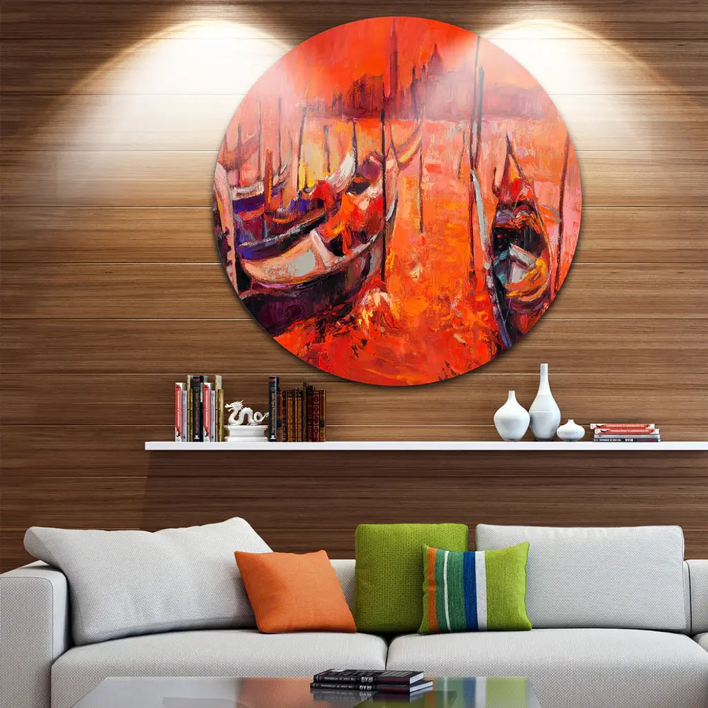 Red Sunset Over Venice, Landscape Painting Disc Metal Artwork, 23"