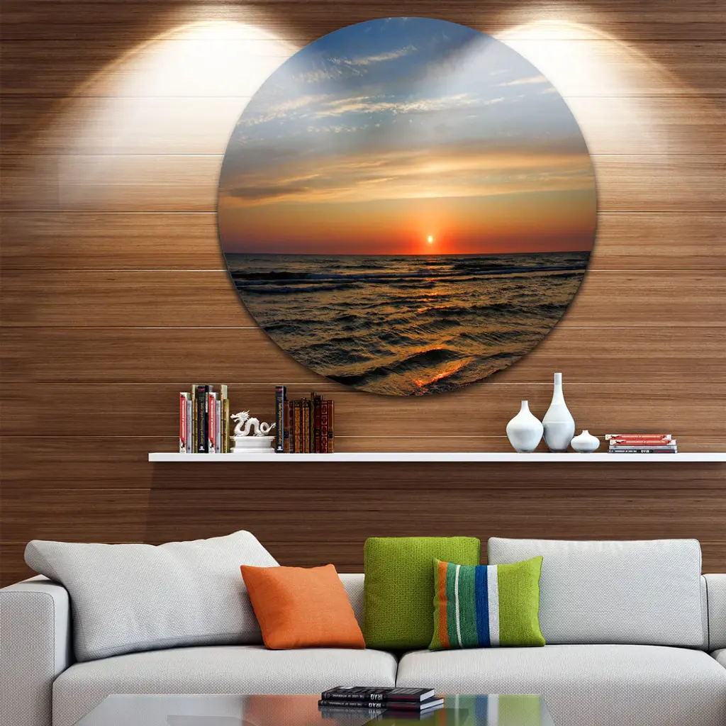 Red Sunset With Dark Ocean Waves, Seashore Round Metal Wall Art, 11"