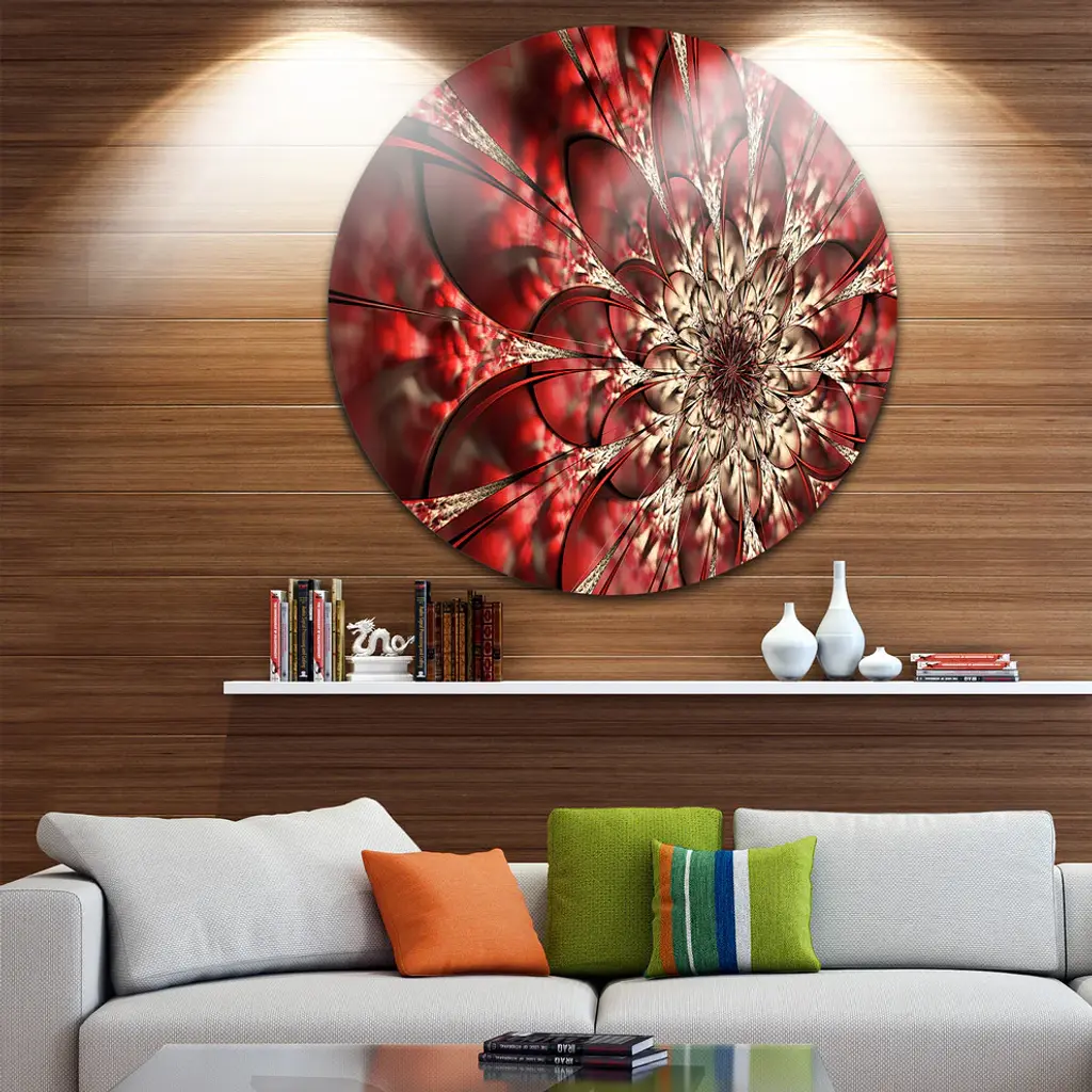 Bring Contemporary Abstraction to your home with this large Circle Metal wall art. This Red Symmetrical Flowers Pattern Metal Artwork makes it the focal point of any room or office. - White Gloss Coating ensures colors are extra vibrant with light reflection.- Aluminum grade Sheet Metal with 1 inch mounting frame on the back giving the illusion that the artwork is floating on the wall..- Mounting Brackets are included along with instructions.- High Quality Digital images are created directly into a glossy aluminum panel producing a stunning and captivating print into the glossy finish of the metal.- Water, Fire and Scratch resistant HD Aluminum panels.- Looks better than any photo paper and guaranteed to last at least 20 years- Easy to clean with a microfiber cloth. Colors are far superior to regular Canvas Art. - Easy to Hang