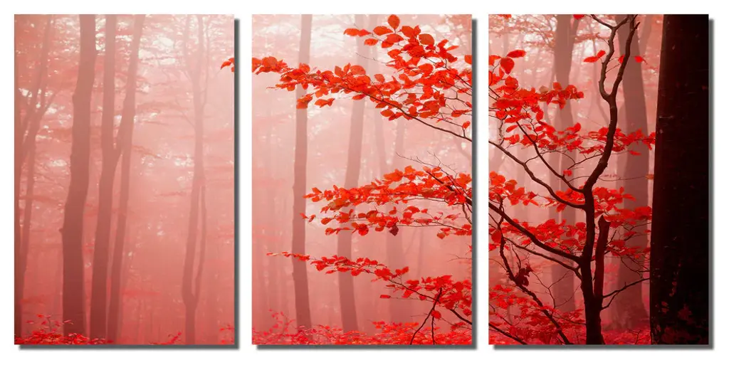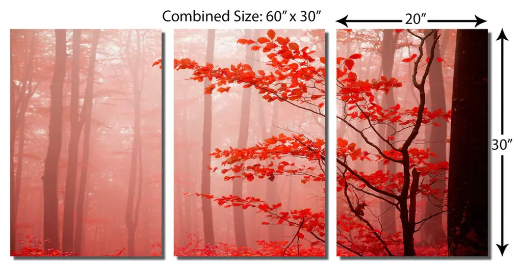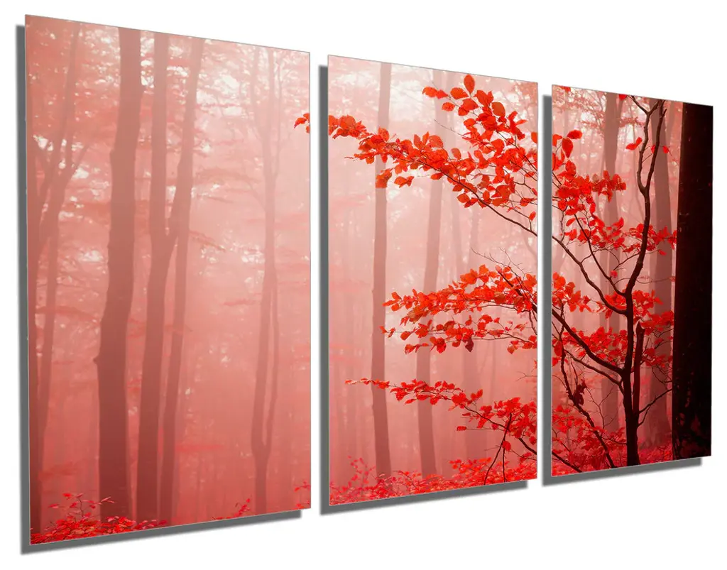 60"œ x 30"œ total size. Ready To Hang! (3 pieces - 20"œ x 30"œ each). 3 Panel Split (Triptych) Metal Print featuring Red Tree & Foggy Forest Mist. Modern metal wall art for home or office wall decor & interior design. Printed on Luxurious, HD aluminum glossy metal panels. Multi panel art.. HD aluminum panels. Metal print wall art. Includes Shadow Wall Mount on the back.• Aluminum Metal Wall Art• Made in USA• Ready to hang - No assembly required• Shadow mount hardware on the back• 0.045"œ thick HD Aluminum Panels• Scratch resistant, glossy finish• Superb color clarity, luxurious prints• Epson printing process• For indoor or moisture rich environment use• Easy to clean. Gently wipe with microfiber cloth.