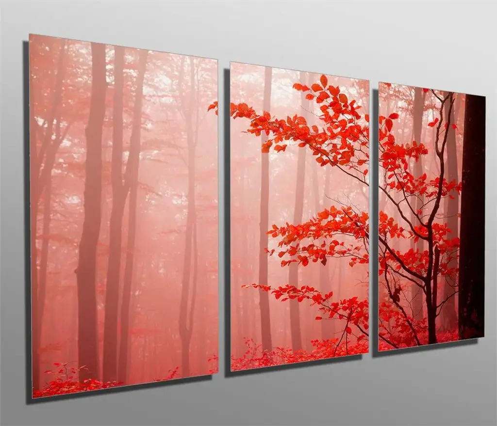 72"œ x 36"œ total size. Ready To Hang! (3 pieces - 24"œ x 36"œ each). 3 Panel Split (Triptych) Metal Print featuring Red Tree & Foggy Forest Mist. Modern metal wall art for home or office wall decor & interior design. Printed on Luxurious, HD aluminum glossy metal panels. Multi panel art.. HD aluminum panels. Metal print wall art. Includes Shadow Wall Mount on the back.• Aluminum Metal Wall Art• Made in USA• Ready to hang - No assembly required• Shadow mount hardware on the back• 0.045"œ thick HD Aluminum Panels• Scratch resistant, glossy finish• Superb color clarity, luxurious prints• Epson printing process• For indoor or moisture rich environment use• Easy to clean. Gently wipe with microfiber cloth.