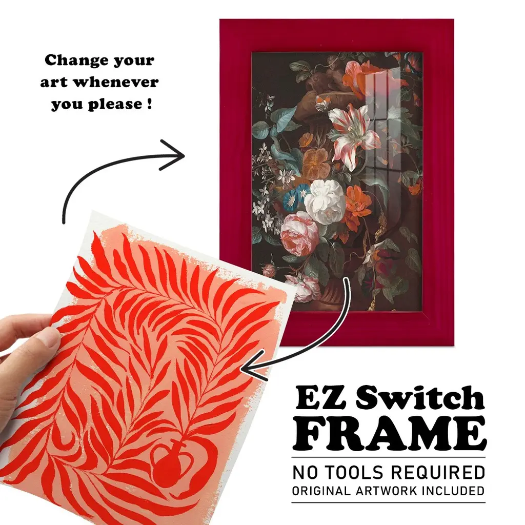 Red Vines II -EZ SWITCH Framed Print w/glass-Cherry Red A delightful, framed print. Featuring a solid wood frame with real wood glass. This premium print is giclee quality. In addition, every frame features a removable back and table top stand. This allows you to change your art in the future or to just stand the art on a table for a new look. We are sure you'll enjoy our new series of EZ SWITCH Framed Art. Solid Wood Frame Real Glass Removable / Replaceable Art Built in Tabletop Stand Sizes range from 4x6 up to 12x15 - buy just one or pair them up as sets as you see fit.