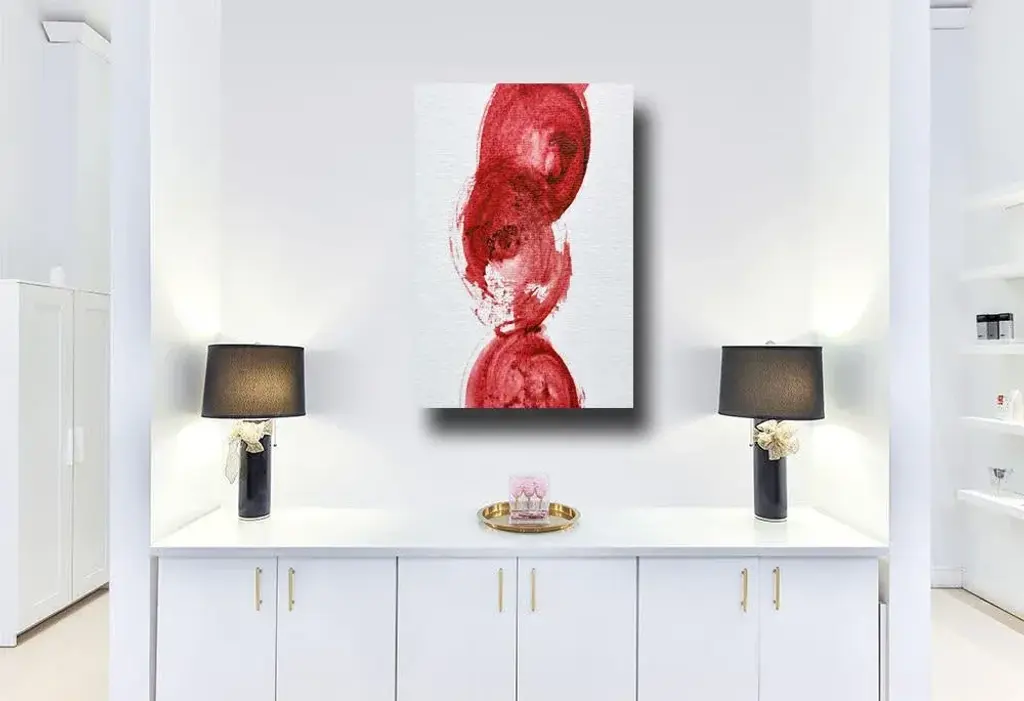 RED WHIRL is a modern abstract original art print. Deep red on a white background. This is a stretched canvas print, ready to hang right out of the box (hanging hardware included). Hang vertically or horizontally. The background has a bit of a textured look (paper) but the print is a smooth surface. Image wrapped around sides. Sides are 1.5" Size: 16" x 20"