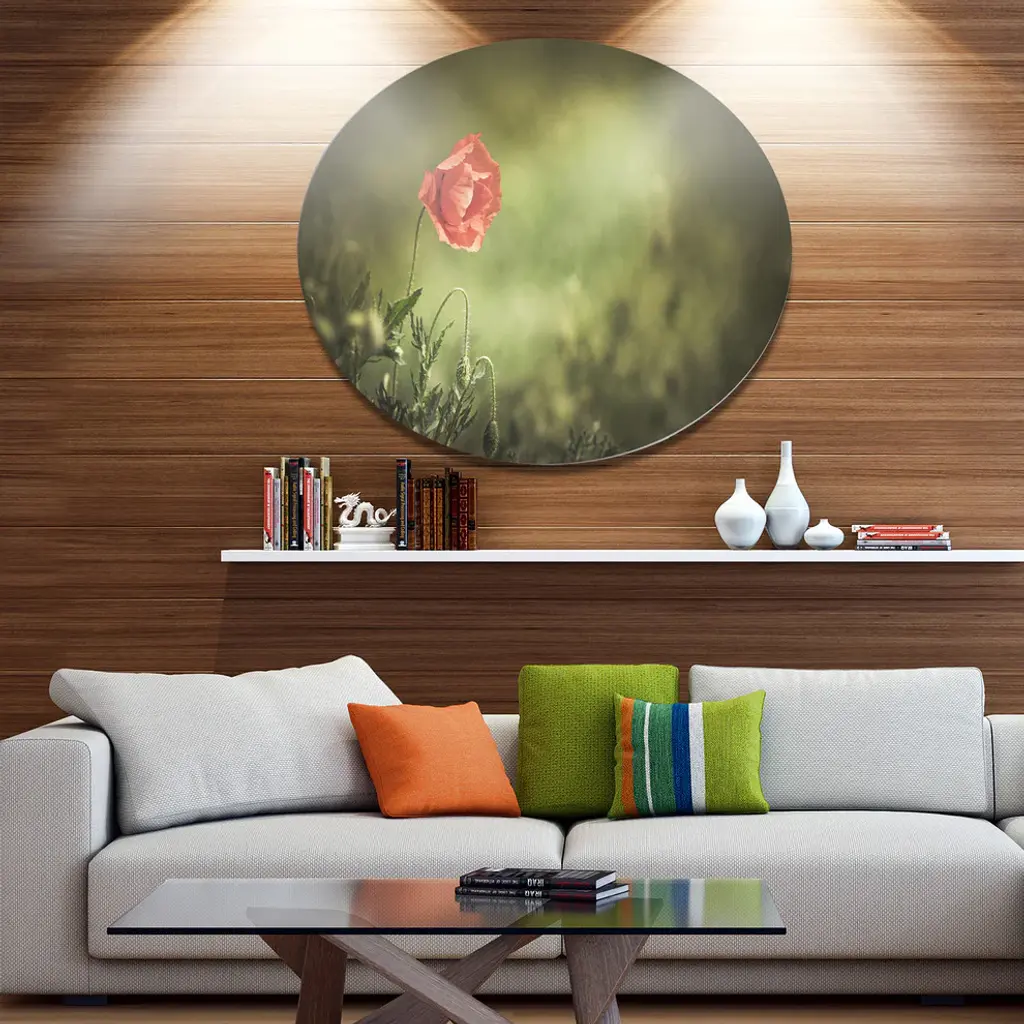 Red Wild Poppy Flower On Green, Modern Floral Disc Metal Artwork, 23"