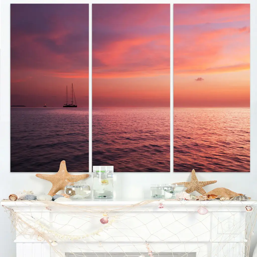 "Reddish Serene Maldives Seashore" Metal Wall Art, 3 Panels, 36"x28"