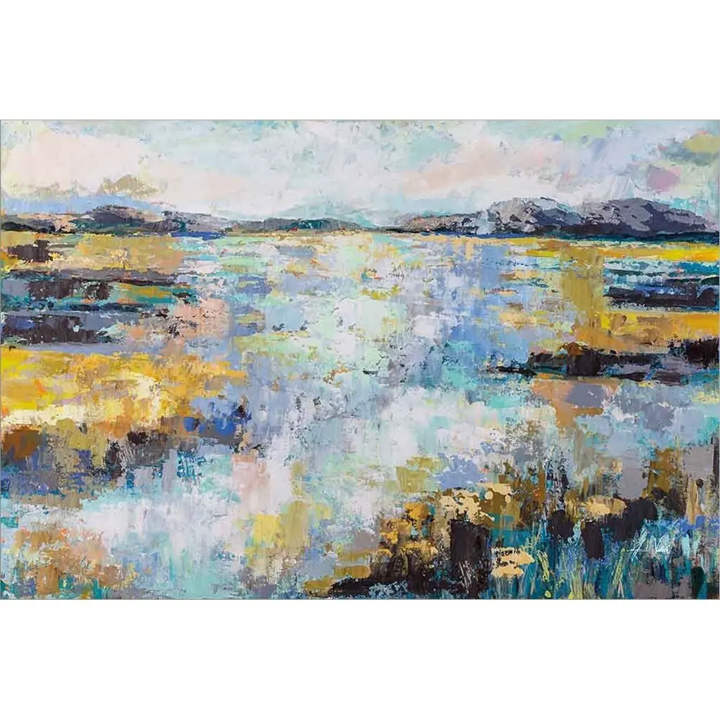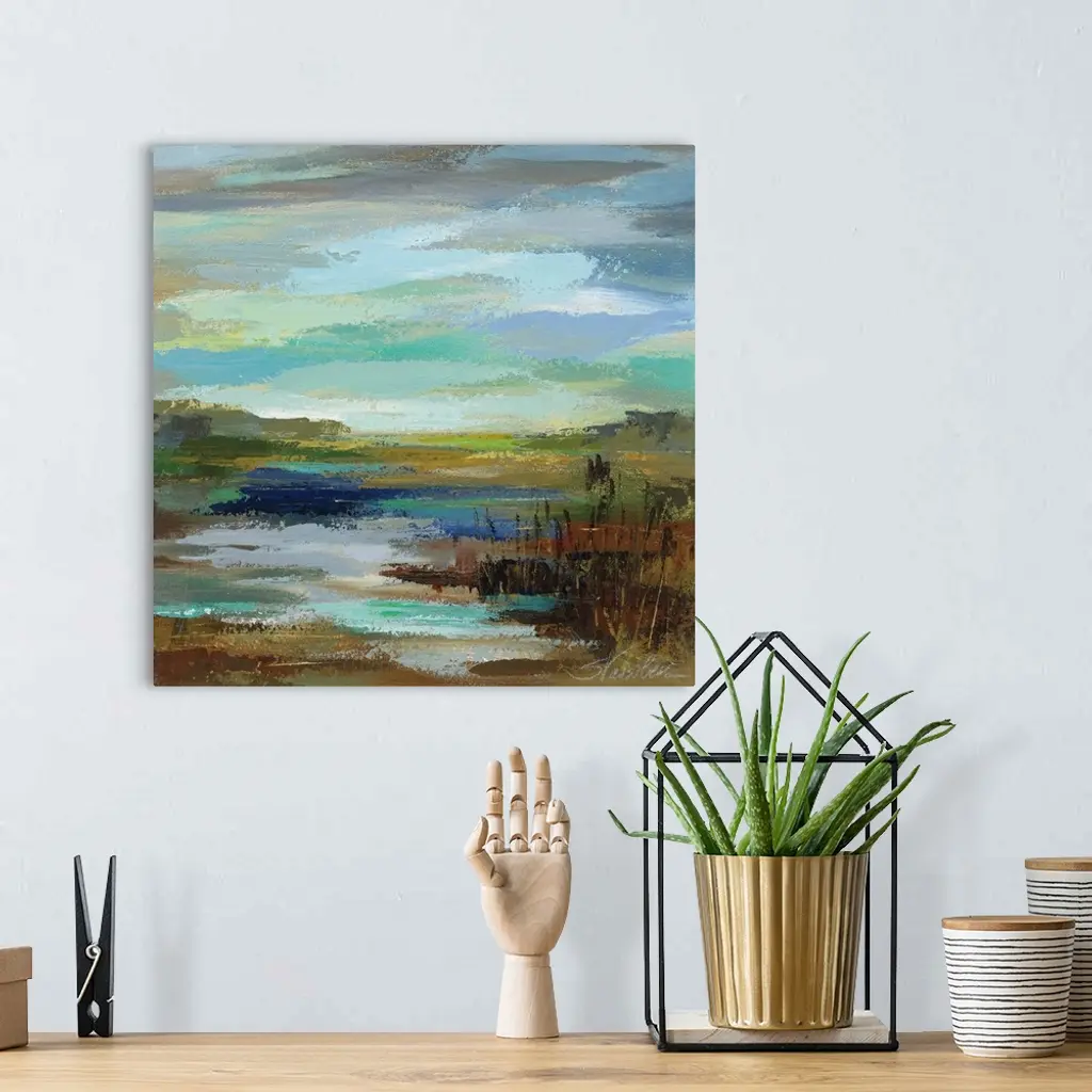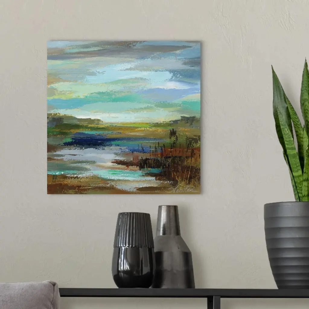 Contemporary landscape painting of the edge of a lake with reeds and a gloomy sky.