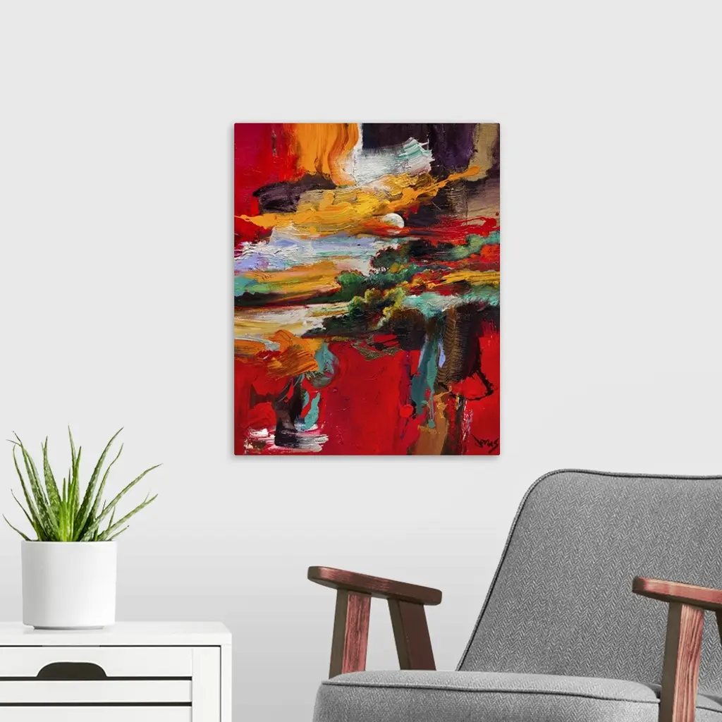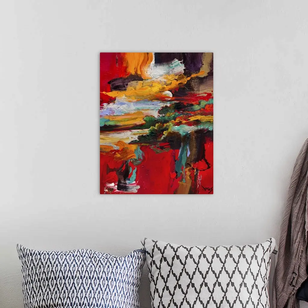 Contemporary abstract painting using wild and vivid colors to create movement and depth.