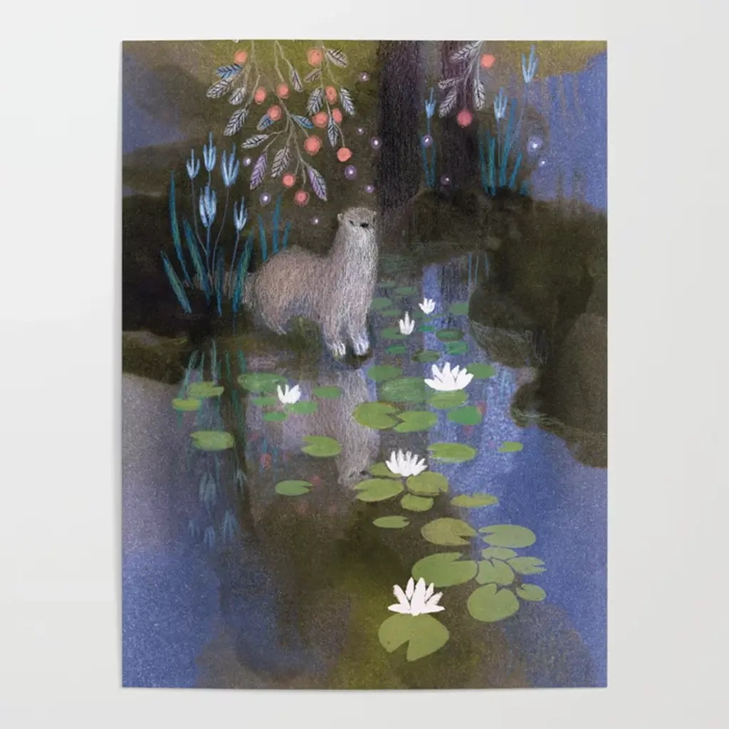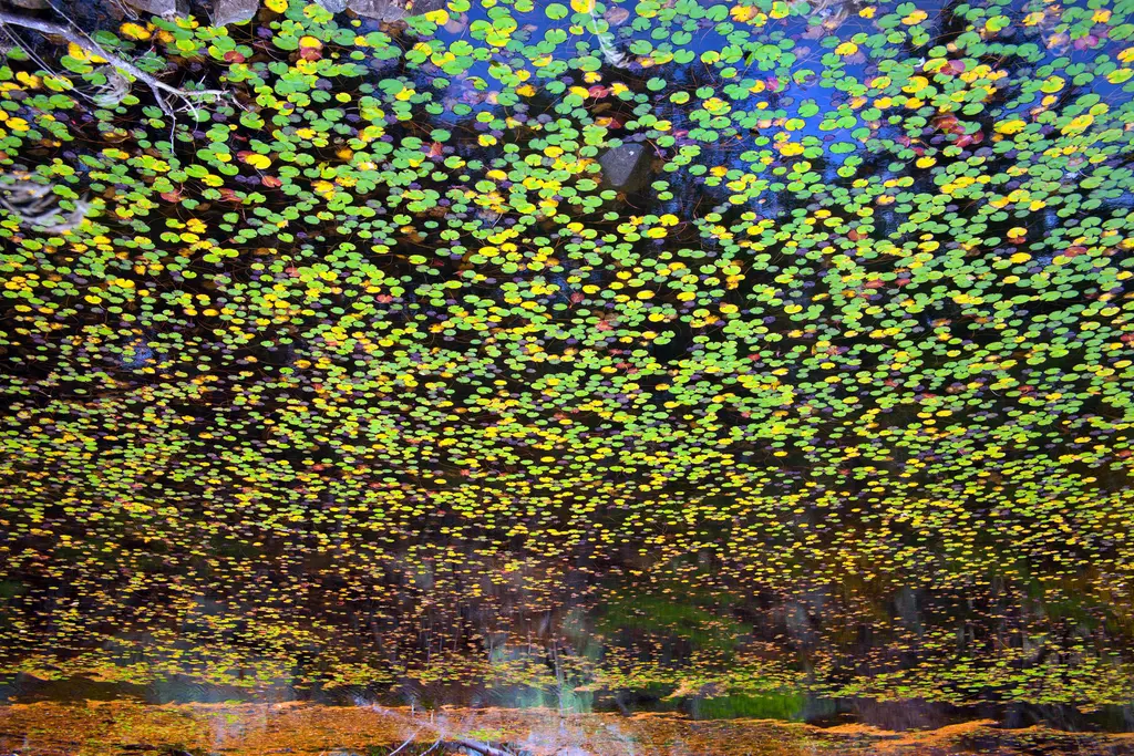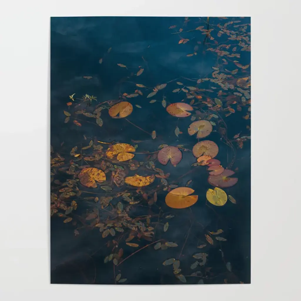 A vibrant and cool landscape reflection photograph of a treeline in Fall. It's printed on archival paper that measures 16" x 24" and is in excellent condition.