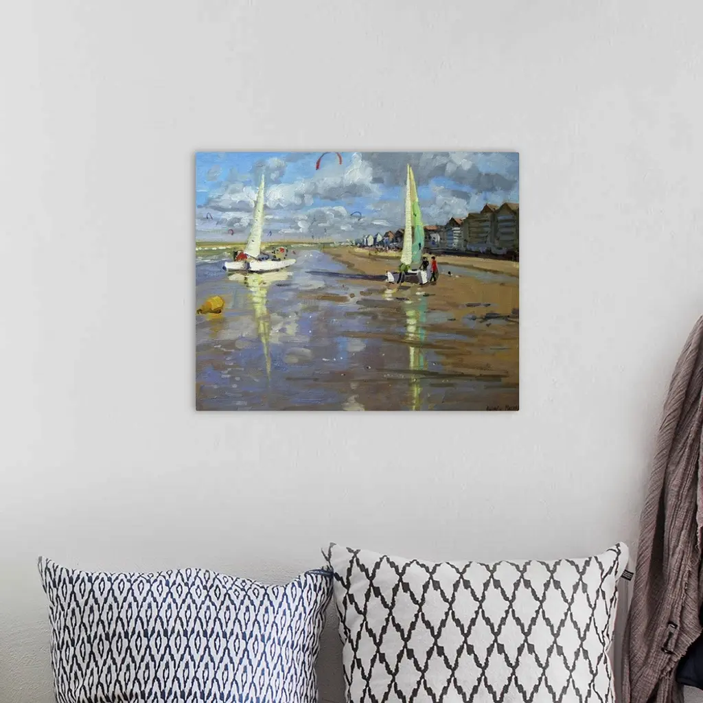 Piece of contemporary artwork that has two sail boats about to set off in the ocean. The beach is lined with houses to the right.