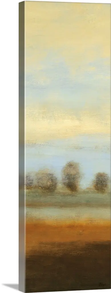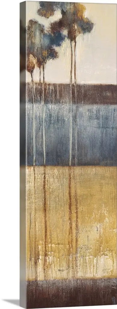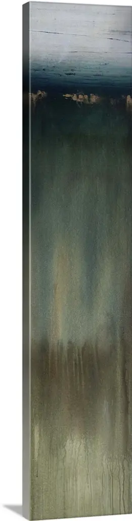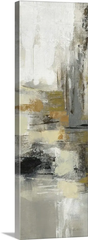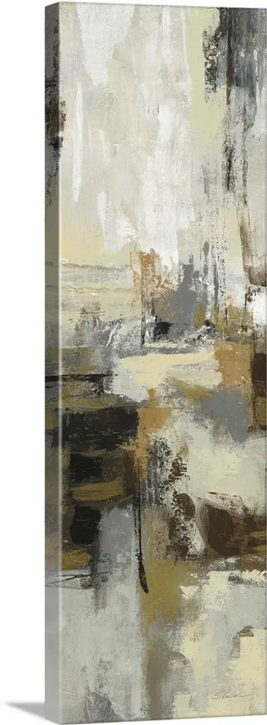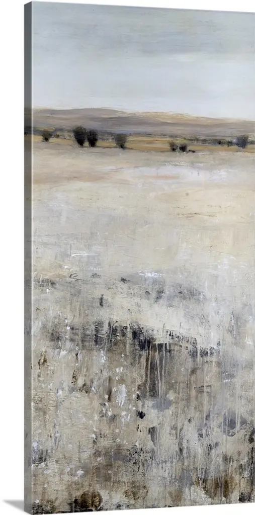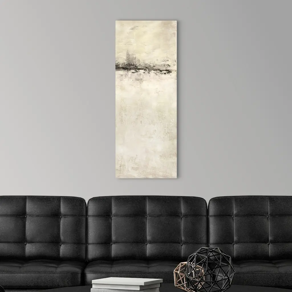 A long vertical abstract painting of a rough stroked black horizontal line on textured beige.