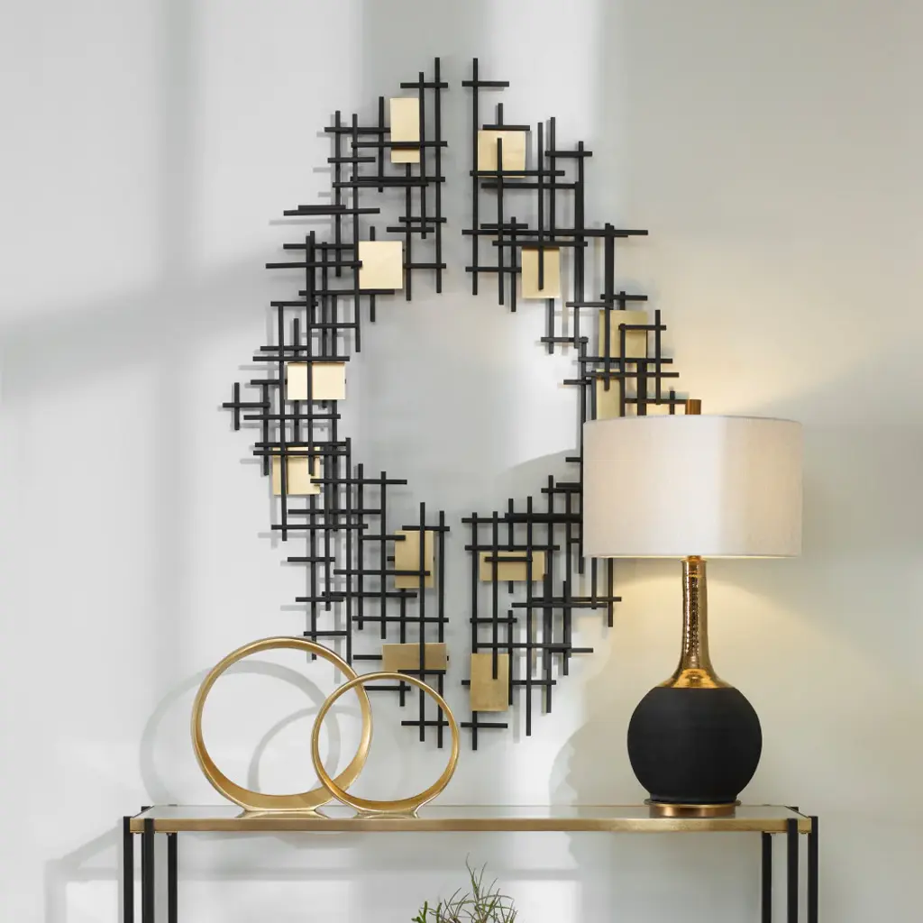 Set Of Two Contemporary Wall Pieces Display Overlapping Iron Grids Finished In Matte Black With Gold Leaf Accents. May Be Hung Horizontal Or Vertical.Material: IronDesigner: Grace FeyockOverall Depth: 2.375Overall Width: 18.75Overall Height: 57.5Product Weight: 14 lbs.
