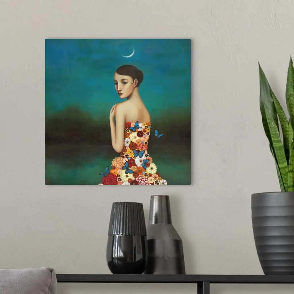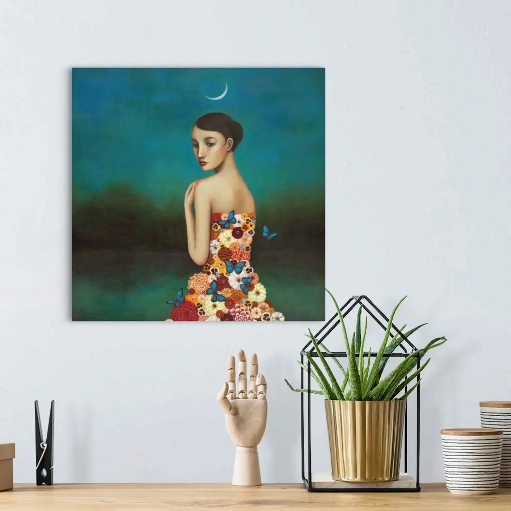Contemporary surreal artwork of a woman wearing a dress made of flowers with a crescent moon overhead.