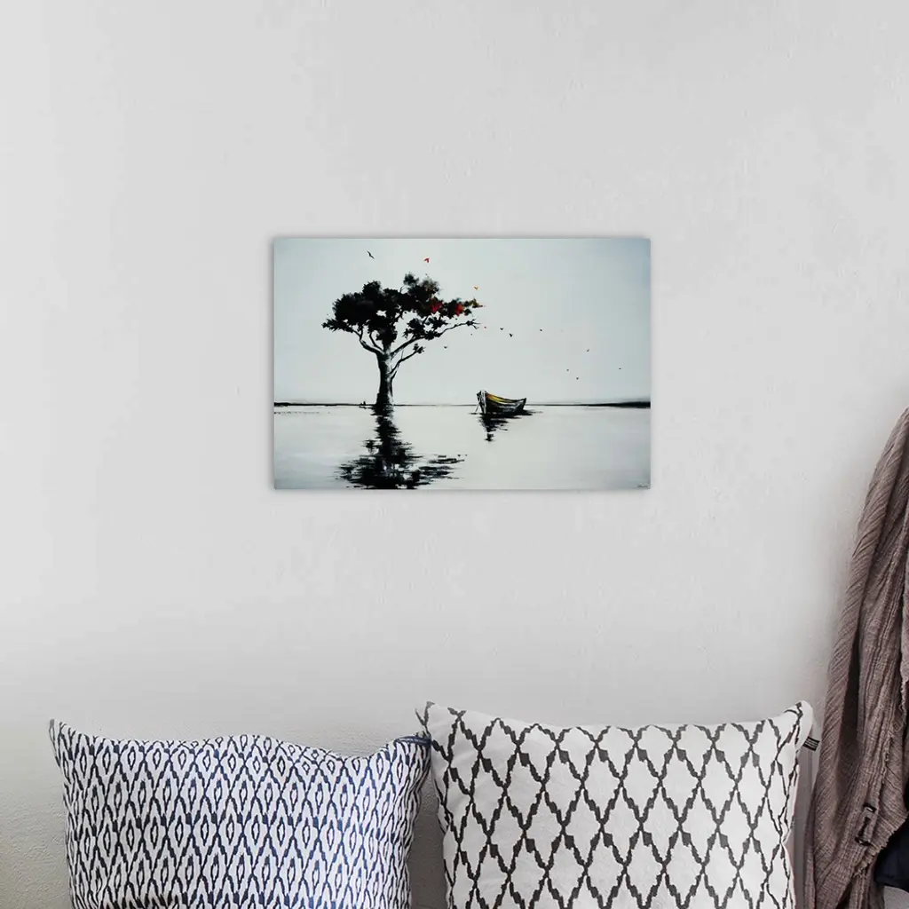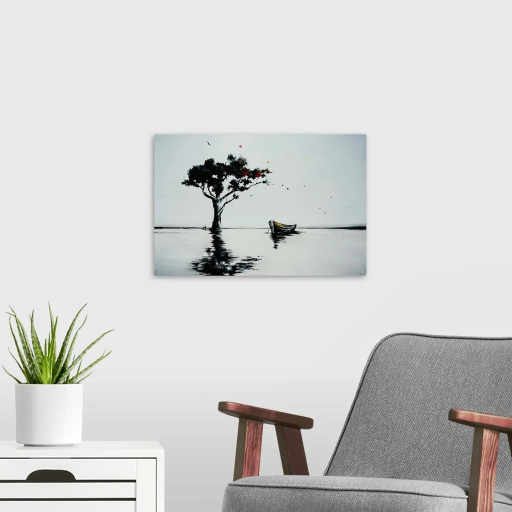 Landscape painting of an empty row boat sitting in calm water beneath a large tree on the horizon, as birds fly overhead in an open, cloudless sky.
